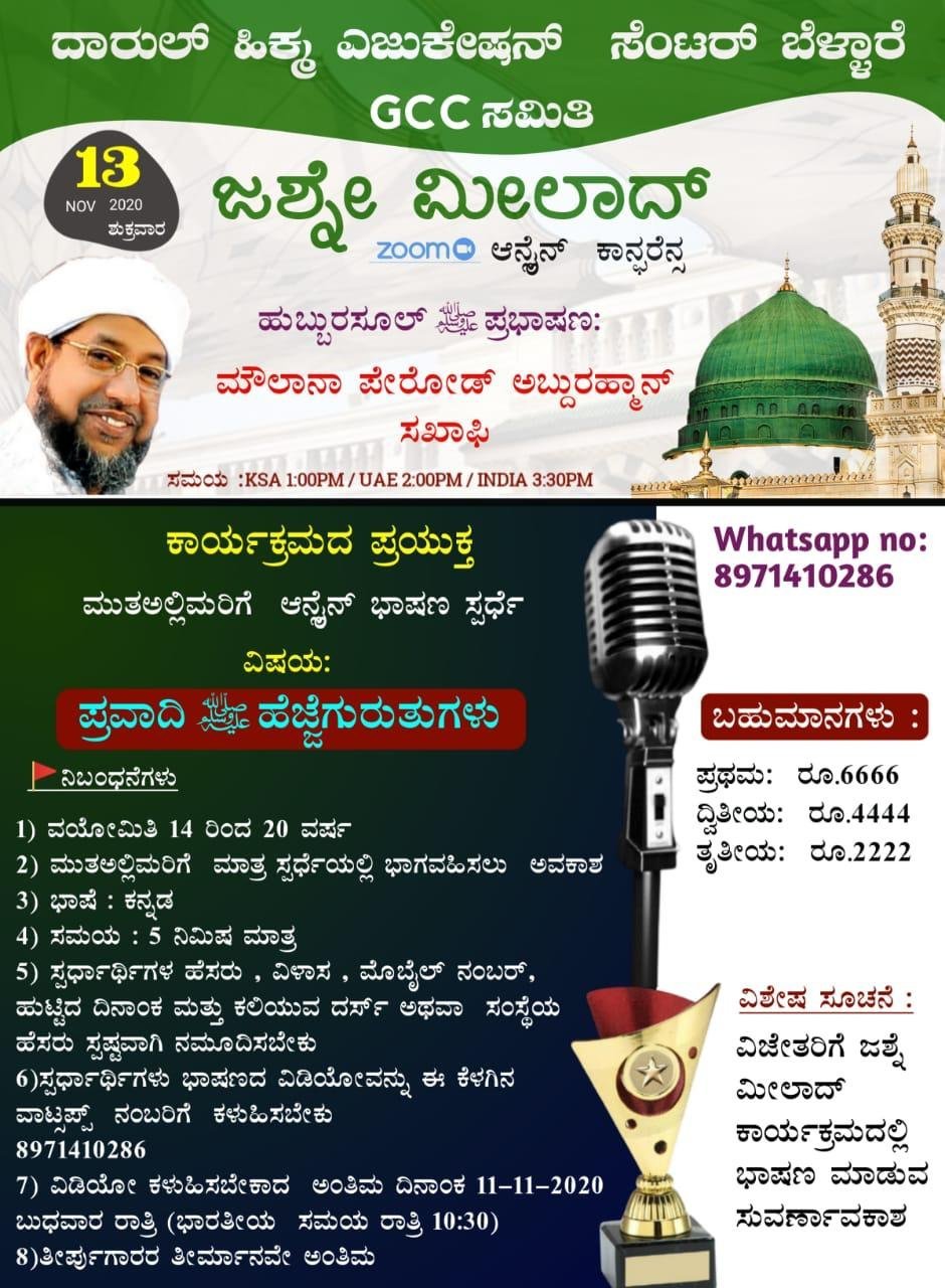 ದುಬೈ:-ದಾರುಲ್ ಹಿಕ್ಮಾ ಎಜುಕೇಷನ್ ಸೆಂಟರ್ ಬೆಳ್ಳಾರೆ ಇದರ GCC ಸಮಿತಿಯ ವತಿಯಿಂದ ಪ್ರಪ್ರಥಮ ಬಾರಿಗೆ ಬೃಹತ್ “ಜಶ್ನೇ ಮೀಲಾದ್ 2020” ಆನ್ಲೈನ್ ಕಾನ್ಫರೆನ್ಸ್ ಕಾರ್ಯಕ್ರಮವು Zoom ಮುಖಾಂತರ ನಡೆಯಲಿದೆ.