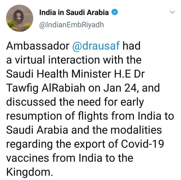 ಸೌದಿ ಆರೋಗ್ಯ ಸಚಿವ ಡಾ.ತೌಫಿಕ್ ಅಲ್-ರಬಿಯಾ ಅವರೊಂದಿಗೆ ಮಾತುಕತೆ ನಡೆಸಿರುವ ಸುದ್ದಿಯನ್ನು ಸೌದಿ ಅರೇಬಿಯಾದ ಭಾರತೀಯ ರಾಯಭಾರ ಕಚೇರಿ ಸಾಮಾಜಿಕ ಮಾಧ್ಯಮದಲ್ಲಿ ಹಂಚಿಕೊಂಡಿದೆ. ಭಾರತದಿಂದ ಸೌದಿ ಅರೇಬಿಯಾಕ್ಕೆ ಕೋವಿಡ್ ಲಸಿಕೆ ರಫ್ತು ಮಾಡುವ ಬಗ್ಗೆ ಕೂಡ ಚರ್ಚಿಸಲಾಗಿದೆ ಎಂದು ದೂತಾವಾಸ ತಿಳಿಸಿದೆ.