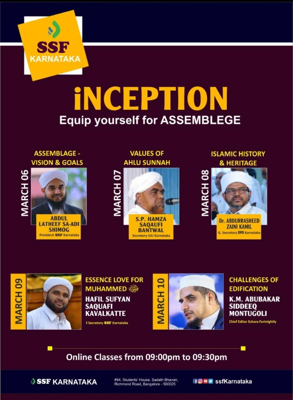 ಎಸ್ಸೆಸ್ಸೆಫ್ ಕರ್ನಾಟಕ ರಾಜ್ಯ ಸಮಿತಿ ವತಿಯಿಂದ ಮಾರ್ಚ್ 13 ಹಾಗೂ 14 ರಂದು ತಾಜುಸ್ಸುನ್ನ ಭಟ್ಕಳದಲ್ಲಿ ನಡೆಯುವ ಅಸಂಬ್ಲೇಜ್ ಕಾರ್ಯಾಗಾರದ ಸಿದ್ದತೆಗಾಗಿ ಅಸಂಬ್ಲೇಜ್ ಪೂರ್ವಭಾವಿ ಇನ್ಸೆಪ್ಶನ್ ಕಾರ್ಯಗಾರಗಳು ಮಾರ್ಚ್ 6,7,8,9,10 ದಿನಾಂಕಗಲ್ಲಿ ಎಸ್ಸೆಸ್ಸೆಫ್ ರಾಜ್ಯಾಧ್ಯಕ್ಷ ಅಬ್ದುಲ್ಲತೀಫ್ ಸಅದಿ ಶಿವಮೊಗ್ಗರವರ ಆದ್ಯಕ್ಷತೆಯಲ್ಲಿ ಆನ್ಲೈನ್ ನಲ್ಲಿ ನಡೆಯಲಿರುವುದು.
