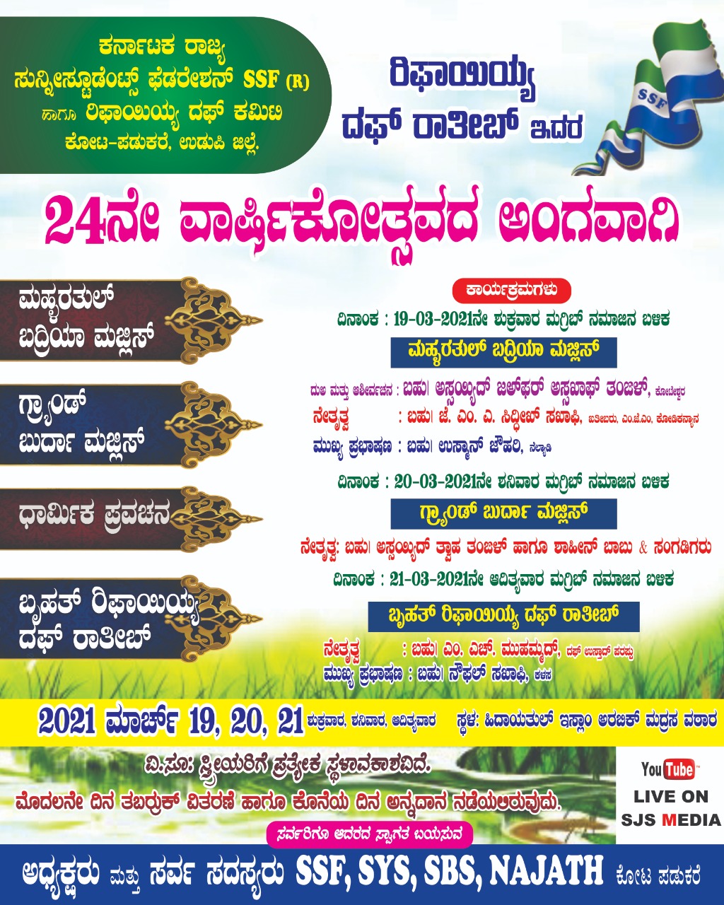 ಕುಂದಾಪುರ, ಮಾರ್ಚ್ 19; ಕುಂದಾಪುರ ಡಿವಿಷನ್ ವ್ಯಾಪ್ತಿಯ ಎಸ್ಸೆಸ್ಸೆಫ್ ಕೋಟ-ಪಡುಕೆರೆ ಶಾಖೆ ಇದರ ವತಿಯಿಂದ ಇಂದಿನಿಂದ (ಮಾರ್ಚ್ 19 to 21) ತ್ರಿದಿನಗಳಲ್ಲಿ ಮಹ್’ಳರತುಲ್ ಬದ್ರಿಯ್ಯಃ, ಬುರ್ದಾ ಮಜ್ಲಿಸ್, ದಫ್ ರಾತೀಬ್ ಕಾರ್ಯಕ್ರಮಗಳು ಮಗ್ರಿಬ್ ನಮಾಝಿನ ಬಳಿಕ ನಡೆಯಲಿದ್ದು, ಉಲಮಾ-ಉಮಾರಾ ನಾಯಕರು, ಸಂಘ ಸಂಸ್ಥೆಗಳ ಪ್ರತಿನಿಧಿಗಳು ಭಾಗವಹಿಸಲಿದ್ದಾರೆ.