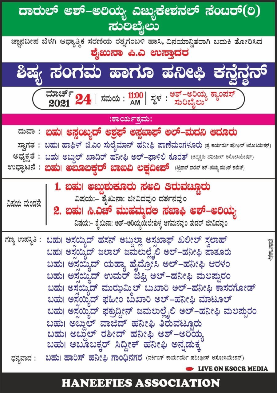 ವಿನಯಾನ್ವಿತರಾಗಿ ಬದುಕಿ ತೋರಿಸಿದ ಶೈಖುನಾ ಶೈಖುನಾ PA ಉಸ್ತಾದರ ಶಿಷ್ಯ ಸಂಗಮ ಮತ್ತು ಹನೀಫಿ ಕನ್ವೆನ್ಶನ್ ನಾಳೆ (ಮಾ.24) ಸುರಿಬೈಲು ದಾರುಲ್ ಅಶ್ ಅರಿಯ್ಯಾ ಕ್ಯಾಂಪಸ್ನಲ್ಲಿ ನಡೆಯಲಿದೆ.