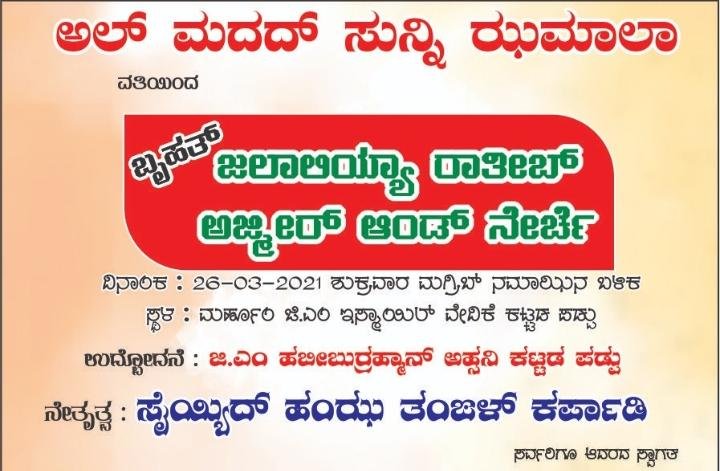 ಅಲ್ ಮದದ್ ಸುನ್ನಿ ಝುಮಲಾ ಗ್ರೂಪ್ ವತಿಯಿಂದ ಮೂರನೇ ವಾರ್ಷಿಕ ಬೃಹತ್ ಜಲಾಲಿಯ್ಯ ರಾತೀಬ್ ಹಾಗೂ ಅಜ್ಮೀರ್ ಅಂಡ್ ನೇರ್ಚೆಯು ಇದೇ ಬರುವ 26 ನೇ ತಾರೀಖು ಶುಕ್ರವಾರ ಅಸ್ತಮಿಸುವ ಶನಿವಾರ ರಾತ್ರಿಯು ಕಟ್ಟದಪಡ್ಪು ಮರ್ಹೂಂ ಜಿ.ಎಂ ಇಸ್ಮಾಯಿಲ್ ವೇದಿಕೆಯಲ್ಲಿ ನಡೆಯಲಿದೆ.