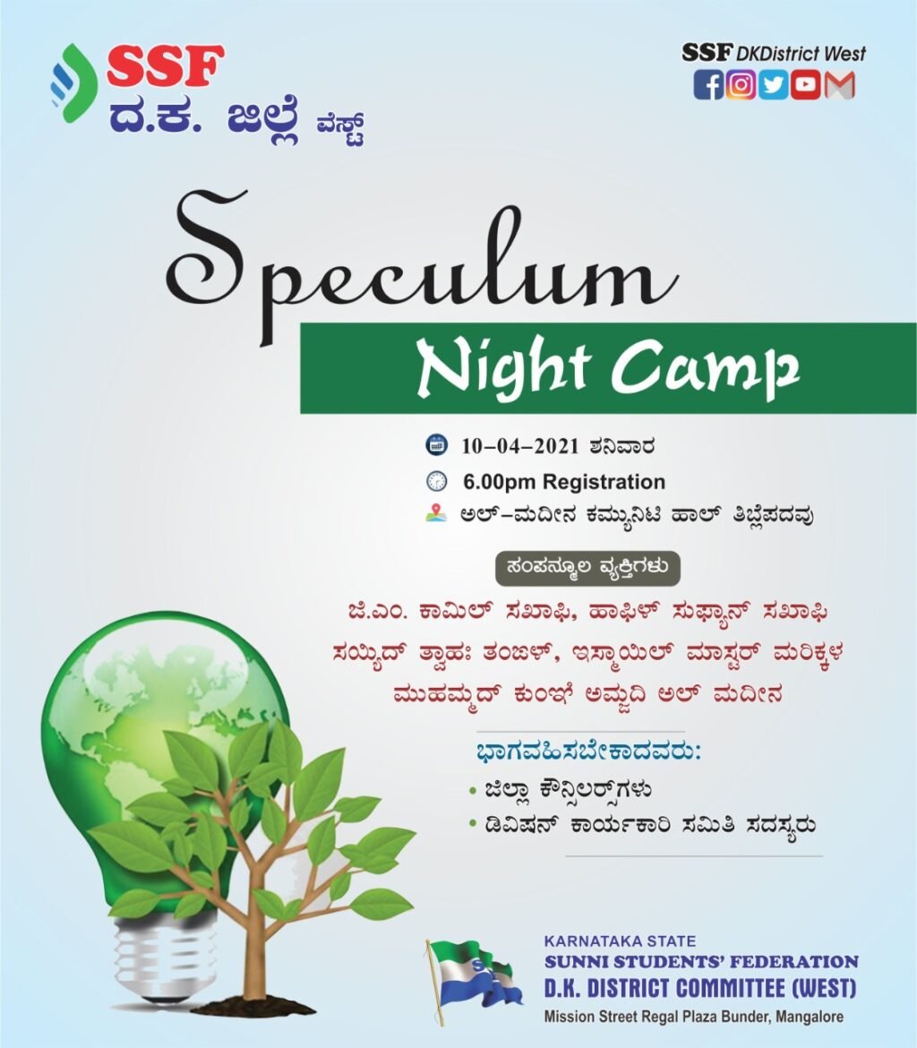 ಮಂಗಳೂರು : ಎಸ್ಸೆಸ್ಸೆಫ್ ದ.ಕ ಜಿಲ್ಲಾ ವೆಸ್ಟ್ ಸಮಿತಿ ವತಿಯಿಂದ ಜಿಲ್ಲಾ ಕೌನ್ಸಿಲರ್ಸ್‌ಗೆ ಹಾಗೂ ಡಿವಿಷನ್ ಕಾರ್ಯಕಾರಿ ಸಮಿತಿ ಸದಸ್ಯರಿಗೆ “ಸ್ಪೆಕ್ಯುಲಂ ನೈಟ್ ಶಿಬಿರವು” ಅಲ್’ಮದೀನಾ ಕಮ್ಯೂನಿಟಿ ಹಾಲ್, ತಿಬ್ಲೆಪದವಿನಲ್ಲಿ ಎಪ್ರಿಲ್ 10 ಶನಿವಾರ ಸಂಜೆ 6:00 ಗಂಟೆಯಿಂದ ಎಪ್ರಿಲ್ 11 ಆದಿತ್ಯವಾರ ಬೆಳಿಗ್ಗೆ 6:00 ಗಂಟೆಯವರೆಗೆ ನಡೆಯಲಿದೆ.