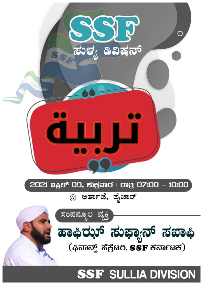 ಕರ್ನಾಟಕ ರಾಜ್ಯ ಸುನ್ನಿ ಸ್ಟುಡೆಂಟ್ಸ್ ಫೆಡರೇಶನ್ (ರಿ) ಎಸ್ಸೆಸ್ಸೆಫ್ ಸುಳ್ಯ ಡಿವಿಷನ ಸಮಿತಿಯ ತರ್ಬಿಯಾ ಕ್ಯಾಂಪ್ ಏಪ್ರಿಲ್ 9 ಶುಕ್ರವಾರ ಪೈಚಾರಿನ ಆರ್ತಾಜೆಯಲ್ಲಿ ನಡೆಯಲಿದೆ. ಶಿಬಿರದಲ್ಲಿ ಡಿವಿಷನ್ ಅಧೀನದ ಐದು ಸೆಕ್ಟರ್ ಗಳ ಅಧ್ಯಕ್ಷ, ಪ್ರ. ಕಾರ್ಯದರ್ಶಿ, ಕೋಶಾಧಿಕಾರಿ ಹಾಗೂ ಎಂಟು ಸೆಕ್ರೆಟರಿಗಳು ಒಳಗೊಂಡ ಸೆಕ್ರಟೇರಿಯೇಟ್ ನಾಯಕರು ಭಾಗವಹಿಸಲಿದ್ದಾರೆ.