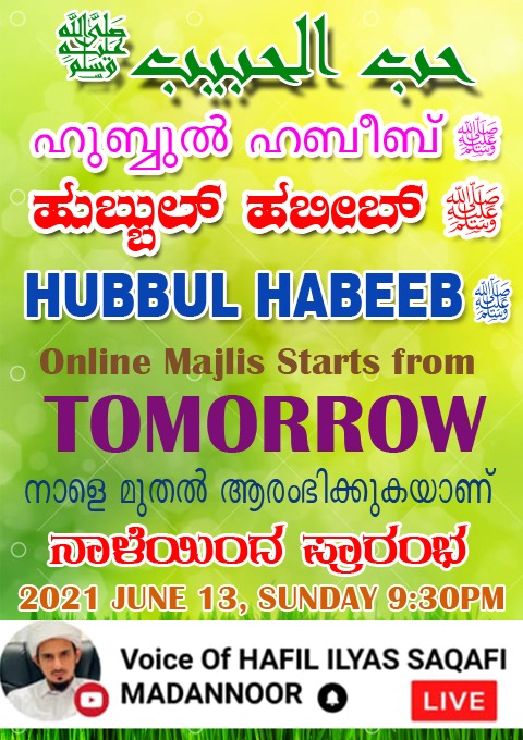 ಹುಬ್ಬುಲ್ ಹಬೀಬ್ﷺ ಆನ್ಲೈನ್ ಮಜ್ಲಿಸ್ ಉದ್ಘಾಟನಾ ಸಮಾರಂಭ ಸಯ್ಯಿದ್ ನಿಝಾಮುದ್ದೀನ್ ಬಾಫಖಿ ಸಖಾಫಿ ಕೊಯಿಲಾಂಡಿ ಇವರ ನೇತೃತ್ವದಲ್ಲಿ ನಡೆಯಲಿದೆ.