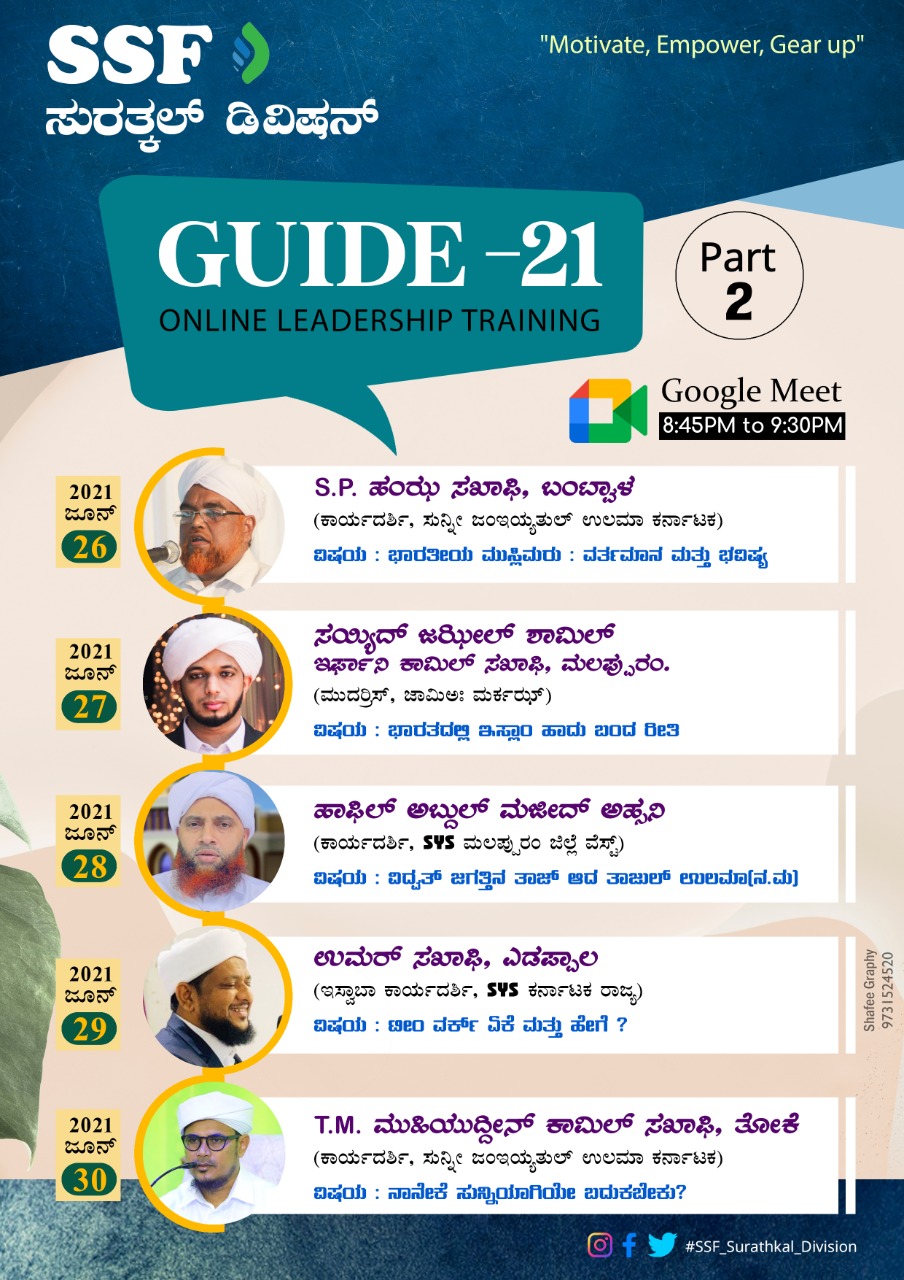 ಜೂನ್ 24 ಸುರತ್ಕಲ್ : ಎಸ್ಸೆಸ್ಸೆಫ್ ಸುರತ್ಕಲ್ ಡಿವಿಷನ್ ಇದರ ವತಿಯಿಂದ ಜೂನ್ 26 ರಿಂದ ಜೂನ್ 30 ರ ತನಕ ಸತತ ಐದು ದಿನಗಳ ” ಗೈಡ್ – 2021″ ಎರಡನೇ ಹಂತದ ಆನ್ಲೈನ್ ತರಗತಿಯು ಗೂಗಲ್ ಮೀಟ್ ಮೂಲಕ ಎಸ್ಸೆಸ್ಸೆಫ್ ಸುರತ್ಕಲ್ ಡಿವಿಷನ್ ಅಧ್ಯಕ್ಷರಾದ ಹನೀಫ್ ಅಹ್ಸನಿ ಕಾಮಿಲ್ ಸಖಾಫಿ ಶೇಡಿಗುರಿಯವರ ಅಧ್ಯಕ್ಷತೆಯಲ್ಲಿ ನಡೆಯಲಿದೆ.