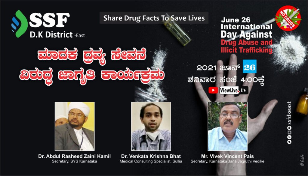 ಬೆಳ್ತಂಗಡಿ: ಅಂತಾರಾಷ್ಟ್ರೀಯ ಮಾದಕದ್ರವ್ಯ ಸೇವನೆ, ಕಳ್ಳಸಾಗಣಿಕೆ ವಿರೋಧಿ ದಿನದ ಅಂಗವಾಗಿ ಎಸ್ಸೆಸ್ಸೆಫ್ ಕ್ಯಾಂಪಸ್ ದ.ಕ ಜಿಲ್ಲೆ (ಈಸ್ಟ್) ವತಿಯಿಂದ ಮಾದಕದ್ರವ್ಯ ಸೇವನೆಯ ವಿರುದ್ದ ಜಾಗೃತಿ ಅಭಿಯಾನ ಕಾರ್ಯಕ್ರಮವನ್ನು ಆನ್ಲೈನ್ ಮೂಲಕ ನಡೆಸಲಾಯಿತು.