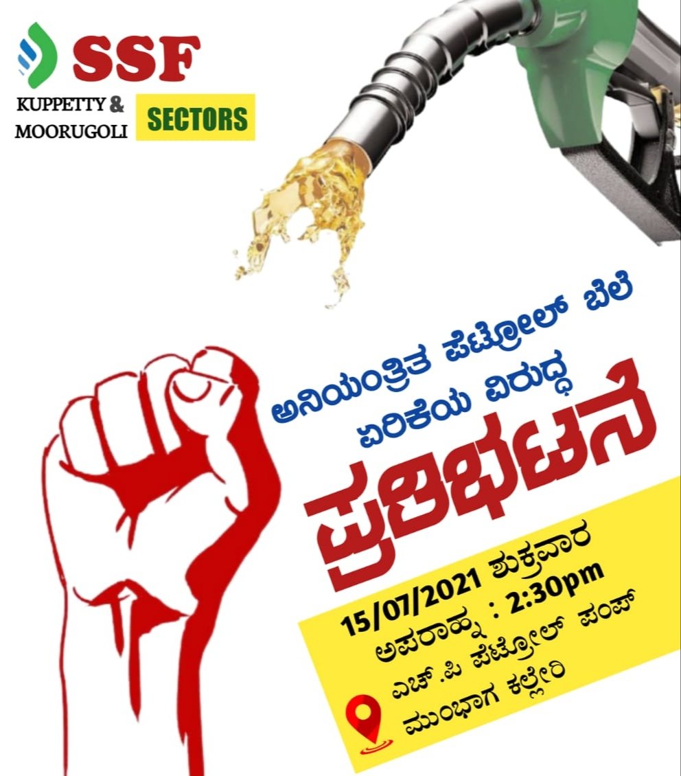 ಕಲ್ಲೇರಿ: ಪೆಟ್ರೋಲ್ ಹಾಗೂ ಅಗತ್ಯ ವಸ್ತುಗಳ ಅನಿಯಂತ್ರಿತ ಬೆಲೆ ಏರಿಕೆಯ ವಿರುದ್ಧ ಎಸ್ಸೆಸ್ಸೆಫ್ ಮೂರುಗೋಳಿ ಸೆಕ್ಟರ್ ಹಾಗೂ ಕುಪ್ಪೆಟ್ಟಿ ಸೆಕ್ಟರ್’ಗಳು ಜಂಟಿಯಾಗಿ ನಾಳೆ ಅಪರಾಹ್ನ 2:30 ಕ್ಕೆ ಸರಿಯಾಗಿ ಕಲ್ಲೇರಿ ಎಚ್.ಪಿ . ಪೆಟ್ರೋಲ್ ಪಂಪಿನ ಬಳಿ ಪ್ರತಿಭಟನೆ ನಡೆಸಲಿದೆ ಎಂದು ಈ ಎರಡು ಸೆಕ್ಟರ್’ಗಳ ನಾಯಕರು ಪತ್ರಿಕಾ ಪ್ರಕಟಣೆಯಲ್ಲಿ ತಿಳಿಸಿದರು.