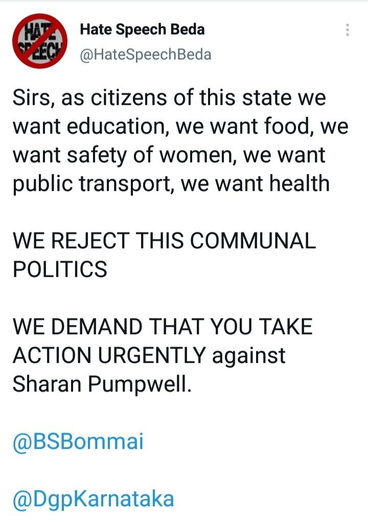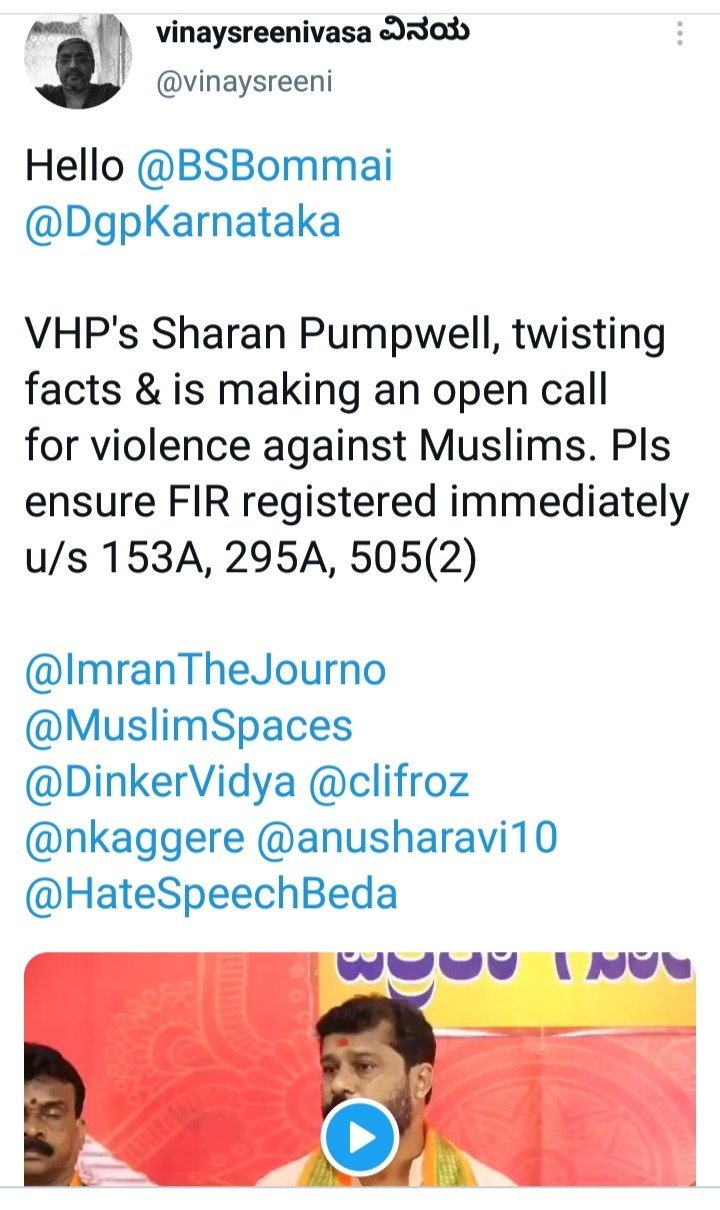 ಪರ್ಯಾಯ ಕಾನೂನು ವೇದಿಕೆಯ ಸಂಚಾಲಕರಾದ ವಿನಯ್‌ ಶ್ರೀನಿವಾಸ್ ಅವರು, “ಮುಖ್ಯಮಂತ್ರಿ ಬೊಮ್ಮಾಯಿ ಮತ್ತು ಕರ್ನಾಟಕದ ಡಿಜಿಪಿ ಅವರೇ, ಶರಣ್ ಪಂಪ್‌ವೆಲ್‌ ಸತ್ಯವನ್ನು ತಿರುಚುತ್ತಿದ್ದಾರೆ. ಅಲ್ಲದೆ ಮುಸ್ಲಿಮರ ವಿರುದ್ದ ಬಹಿರಂಗವಾಗಿ ಹಿಂಸೆಗೆ ಕರೆ ನೀಡುತ್ತಿದ್ದಾರೆ. ದಯವಿಟ್ಟು ಅವರ ವಿರುದ್ದ 153A, 295A, 505 (2) ಅಡಿಯಲ್ಲಿ ತಕ್ಷಣವೆ ಎಫ್ಐಆರ್ ಅನ್ನು ದಾಖಲಿಸಿರುವುದನ್ನು ಖಚಿತ ಪಡಿಸಿ” ಎಂದು ಕೇಳಿದ್ದಾರೆ.