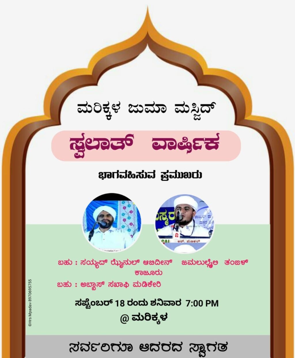 ಮರಿಕ್ಕಳ ಜುಮಾ ಮಸ್ಜಿದ್ ನಲ್ಲಿ ವಾರಕ್ಕೊಮ್ಮೆ ನಡೆಯುವ ಸ್ವಲಾತಿನ ವಾರ್ಷಿಕವು ಮರಿಕ್ಕಳ ಜುಮಾ ಮಸ್ಜಿದ್ ಅಧ್ಯಕ್ಷ ಅಬ್ಬಾಸ್ ಕೊಡಂಚಿಲ್ ರವರ ಅಧ್ಯಕ್ಷತೆಯಲ್ಲಿ ಸೆಪ್ಟಂಬರ್ 18 ಶನಿವಾರ ಸಂಜೆ 7:00 ಗಂಟೆಗೆ ಮರಿಕ್ಕಳ ಮಸ್ಜಿದ್ ನಲ್ಲಿ ನಡೆಯಲಿದೆ.
