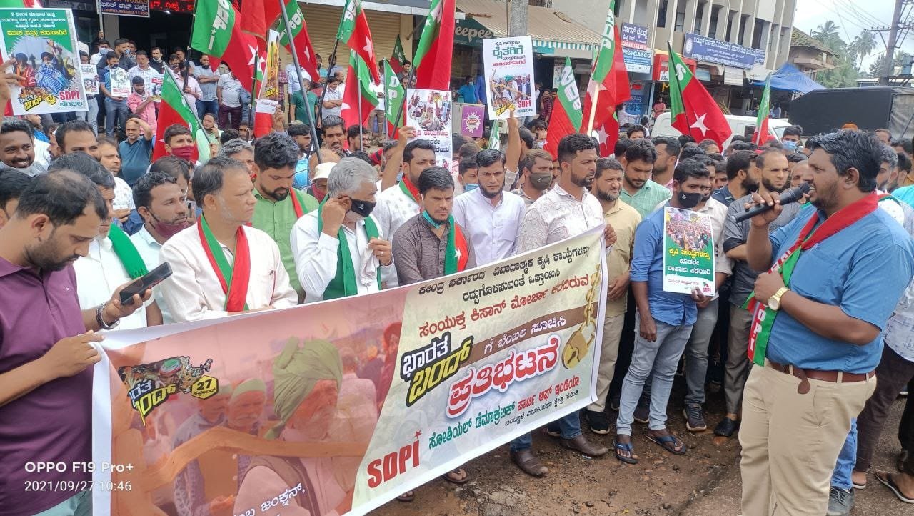 ಬಂಟ್ವಾಳ,ಸೆ.27: ಕೇಂದ್ರ ಸರ್ಕಾರದ ವಿವಾದಾತ್ಮಕ ಕೃಷಿ ಕಾಯ್ದೆಗಳನ್ನು ರದ್ದುಗೊಳಿಸುವಂತೆ ಒತ್ತಾಯಿಸಿ ಸಂಯುಕ್ತ ಕಿಸಾನ್ ಮೋರ್ಚಾ ಕರೆದಿರುವ ಭಾರತ ಬಂದ್ ಗೆ ಬೆಂಬಲ ಸೂಚಿಸಿ ಸೋಶಿಯಲ್ ಡೆಮೋಕ್ರಟಿಕ್ ಪಾರ್ಟಿ ಆಫ್ ಇಂಡಿಯಾ ಬಂಟ್ವಾಳ ಕ್ಷೇತ್ರ ಸಮಿತಿ ವತಿಯಿಂದ ಬೃಹತ್ ಪ್ರತಿಭಟನೆ, ಬೀದಿ ನಾಟಕ ಹಾಗು ರಸ್ತೆ ತಡೆಗೆ ಯತ್ನಿಸಲಾಯಿತು.