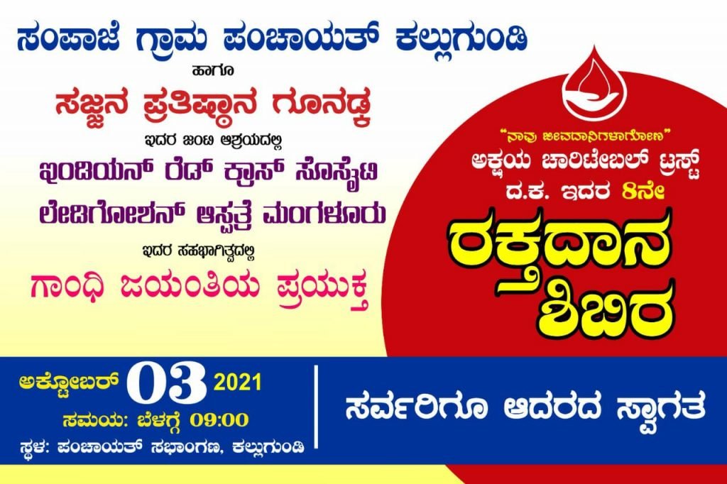 ದಕ್ಷಿಣ ಕನ್ನಡ ಜಿಲ್ಲಾ ವ್ಯಾಪ್ತಿಯಲ್ಲಿರುವ ಎಲ್ಲಾ ರಕ್ತ ನಿಧಿ ಕೇಂದ್ರಗಳಲ್ಲಿ ಅತೀವ ರಕ್ತದ ಕೊರತೆ ಕಂಡು ಬಂದಿದ್ದು ಜೀವ ಜಲವಾಗಿರುವ ರಕ್ತ ಸಿಗಲು ರೋಗಿಗಳು ಹರಸಾಹಸ ಪಡುತ್ತಿದ್ದಾರೆ. ಈ ಹಿನ್ನಲೆಯಲ್ಲಿ ನಾವು ಜೀವದಾನಿಗಳಾಗೋಣ ಎಂಬ ದ್ಯೇಯ ವಾಕ್ಯದೊಂದಿಗೆ ರಕ್ತದಾನ ಶಿಬಿರವನ್ನು ದಿನಾಂಕ :- 3 / 10 / 2021 ರ ಭಾನುವಾರ ಬೆಳಿಗ್ಗೆ 9 ಗಂಟೆಯಿಂದ ಮಧ್ಯಾಹ್ನ 1 ಗಂಟೆಯವರೆಗೆ ಸಂಪಾಜೆ ಗ್ರಾಮ ಪಂಚಾಯತ್ ಕಲ್ಲುಗುಂಡಿ ಹಾಗೂ ಸಜ್ಜನ ಪ್ರತಿಷ್ಠಾನ ಗೂನಡ್ಕ ಇದರ ಜಂಟಿ ಆಶ್ರಯದಲ್ಲಿ ಇಂಡಿಯನ್ ರೆಡ್ ಕ್ರಾಸ್ ಸೊಸೈಟಿ , ಲೇಡಿಗೋಶನ್ ಆಸ್ಪತ್ರೆ ಮಂಗಳೂರು ಇದರ ಸಹಭಾಗಿತ್ವದಲ್ಲಿ ಗಾಂಧಿ ಜಯಂತಿಯ ಪ್ರಯುಕ್ತ ಅಕ್ಷಯ ಚಾರಿಟೇಬಲ್ ಟ್ರಸ್ಟ್ ದ.ಕ . ಇದರ 8 ನೇ ರಕ್ತದಾನ ಶಿಬಿರವನ್ನು ಸಂಪಾಜೆ ಗ್ರಾಮ ಪಂಚಾಯತ್ ಸಭಾಂಗಣ ಸಂಪಾಜೆ ಗ್ರಾಮ ಪಂಚಾಯತ್ ಅಧ್ಯಕ್ಷ ರಾದ ಜಿ.ಕೆ ಅಬ್ದುಲ್ ಹಮೀದ್ ರವರ ಅಧ್ಯಕ್ಷತೆಯಲ್ಲಿ ಹಮ್ಮಿಕೊಂಡಿರುತ್ತೇವೆ.