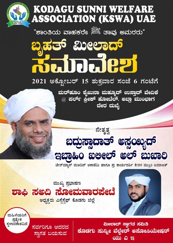 ದುಬೈ: ಕೊಡಗು ಸುನ್ನಿ ವೆಲ್ಫೇರ್ ಅಸೋಸಿಯೇಷನ್ ಯುಎಇ ಸಮಿತಿ ಆಶ್ರಯದಲ್ಲಿ “ಶಾಂತಿ ವಾಹಕರೇ (ಸ) ತಾವು ಅಮರರು” ಎಂಬ ಶೀರ್ಷಿಕೆಯಲ್ಲಿ ಬೃಹತ್ ಮೀಲಾದ್ ಸಮಾವೇಶ ದುಬೈ ದೇರಾದಲ್ಲಿರುವ ಪರ್ಲ್ ಕ್ರೀಕ್ ಹೋಟೆಲ್ ನಲ್ಲಿ ಅಕ್ಟೊಬರ್ 15 ರಂದು ಶುಕ್ರವಾರ ಸಂಜೆ 6 ಘಂಟೆಗೆ ನಡೆಯಲಿದೆ.