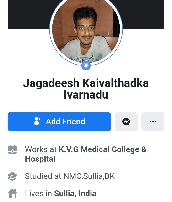 ಈತ KVG ಮೆಡಿಕಲ್ ಕಾಲೇಜು ಮತ್ತು ಆಸ್ಪತ್ರೆಯ ಉದ್ಯೋಗಿಯಾಗಿದ್ದಾನೆಂದು ತನ್ನ ಫೇಸ್ಬುಕ್ ಪೇಜಿನಲ್ಲಿ ಉಲ್ಲೇಸಿದ್ದಾನೆ.