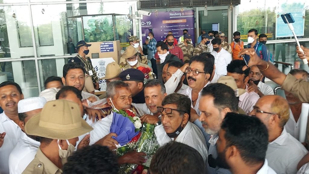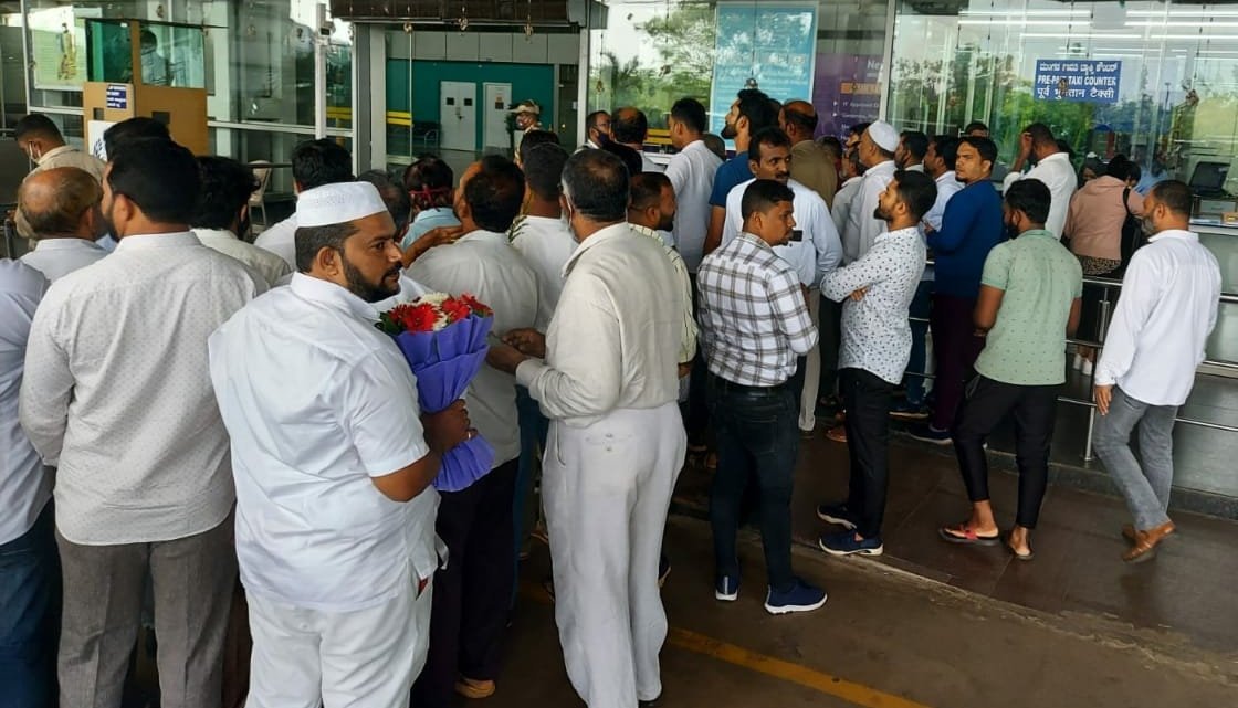 ಮಂಗಳೂರು ಅಂತಾರಾಷ್ಟ್ರೀಯ ವಿಮಾನ ನಿಲ್ದಾಣಕ್ಕೆ ಬಂದಿಳಿದ ಪದ್ಮಶ್ರೀ ಪುರಸ್ಕೃತ ಹರೇಕಳ ಹಾಜಬ್ಬ ಅವರನ್ನು ಸ್ವಾಗತಿಸಲು ವಿಮಾನ ನಿಲ್ಧಾಣದಲ್ಲಿ ಭಾರೀ ಜನ ಸೇರಿದ್ದರು.
