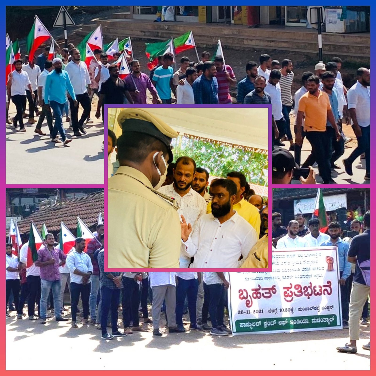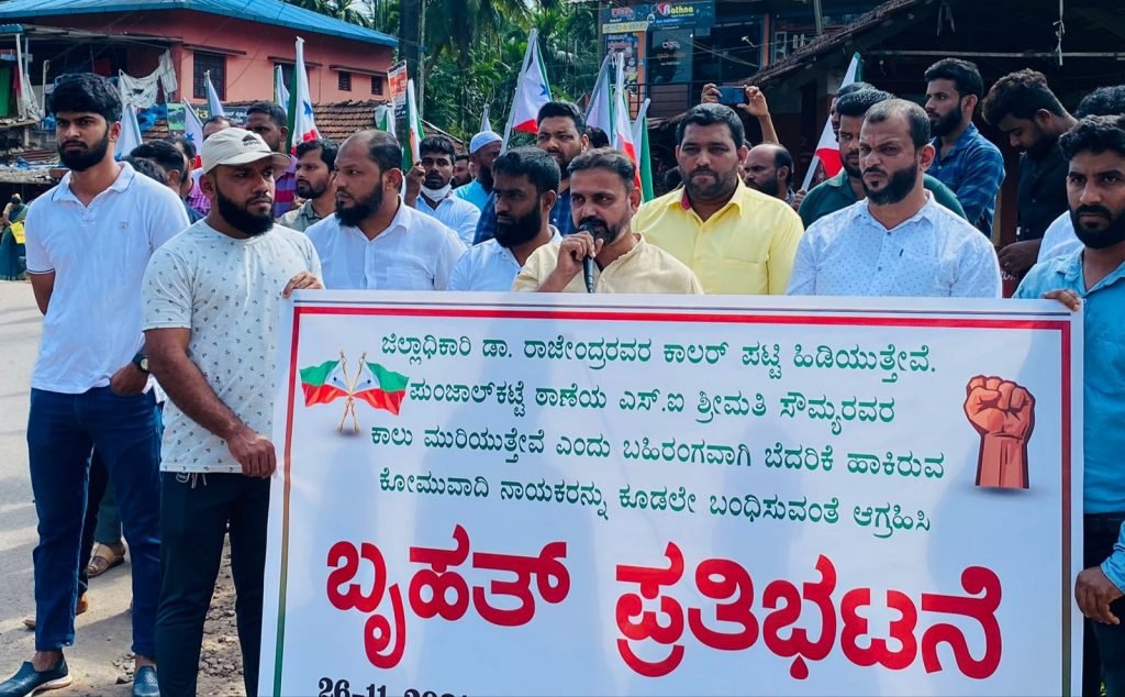 ಬೆಳ್ತಂಗಡಿ,ನ.26: ಹಿಂದೂ ಜಾಗರಣ ವೇದಿಕೆಯ ಮುಖಂಡ ರಾಧಾ ಕೃಷ್ಣ ಅಡ್ಯಂತಾಯ ಪತ್ರಿಕಾಗೋಷ್ಠಿಯೊಂದರಲ್ಲಿ ಪುಂಜಾಲಕಟ್ಟೆ ಠಾಣಾ ಎಸ್ಸೈ ಸೌಮ್ಯ ಇವರ ಕಾಲು ಮುರಿಯುತ್ತೇವೆ ಮತ್ತು ಕಾರಿಂಜದಲ್ಲಿ ಪ್ರಚೋಧನಾಕಾರಿ ಭಾಷಣಕಾರ ಹಿಂದೂ ಜಾಗರಣ ವೇದಿಕೆಯ ಜಗದೀಶ್ ಕಾರಂತ ಜಿಲ್ಲಾಧಿಕಾರಿಯ ಕೊರಳಪಟ್ಟಿ ಹಿಡಿಯುತ್ತೇವೆ ಎಂಬ ಬೆದರಿಕೆ ಹೇಳಿಕೆಗಳ ವಿರುದ್ಧ ಪುಂಜಾಲಕಟ್ಟೆಯಲ್ಲಿ ಪಾಪ್ಯುಲರ್ ಫ್ರಂಟ್ ಆಫ್ ಇಂಡಿಯಾ ಮಡಂತ್ಯಾರು ಡಿವಿಷನ್ ವತಿಯಿಂದ ಪ್ರತಿಭಟನೆ ನಡೆಯಿತು.