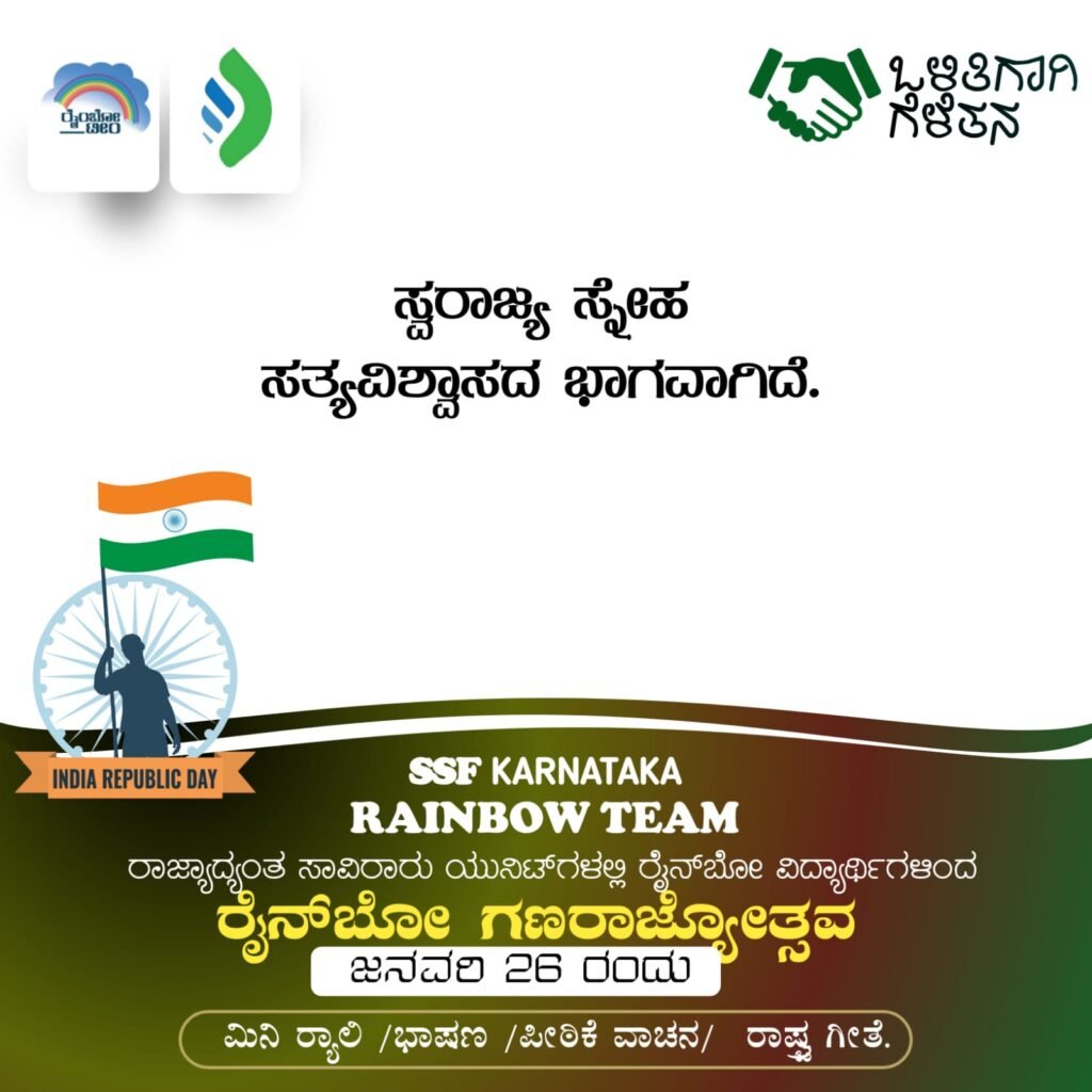 SSF ಕರ್ನಾಟಕ ರಾಜ್ಯ ಸಮಿತಿಯ ಅಧೀನದಲ್ಲಿ ರಾಜ್ಯಾದ್ಯಂತವಿರುವ ಸಾವಿರಾರು ಯುನಿಟ್‌ಗಳಲ್ಲಿ SSF ರೈನ್ ಬೋ ವಿದ್ಯಾರ್ಥಿಗಳಿಂದ ನಾಳೆ(ಜನವರಿ 26) ರಂದು ಸಂಜೆ 4 ಗಂಟೆಗೆ ಗಣರಾಜ್ಯೋತ್ಸವ ಸಂಬಂಧಿತ ವಿಶೇಷ ಕಾರ್ಯಕ್ರಮ ಹಮ್ಮಿಕೊಳ್ಳಲಾಗಿದೆ.