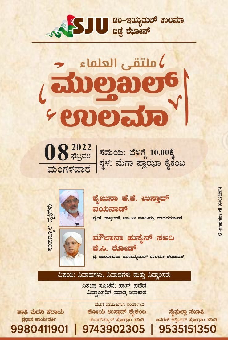 ಕೈಕಂಬ – ಸುನ್ನೀ ಜಂಇಯ್ಯತುಲ್ ಉಲಮಾ ಬಜ್ಪೆ ಝೋನ್ ಇದರ ಆಶ್ರಯದಲ್ಲಿ ವಿದ್ವಾಂಸರಿಗಾಗಿ ಮುಲ್ತಖಲ್ ಉಲಮಾ ಎಂಬ ವಿಶೇಷ ತರಗತಿಯು ಫೆಬ್ರವರಿ 8 ಮಂಗಳವಾರ ಪೂರ್ವಾಹ್ನ 9.30 ರಿಂದ ಮಧ್ಯಾಹ್ನ 1.00 ರ ತನಕ ಮೆಗಾ ಪ್ಲಾಝಾ ದಲ್ಲಿ ನಡೆಯಲಿದೆ.