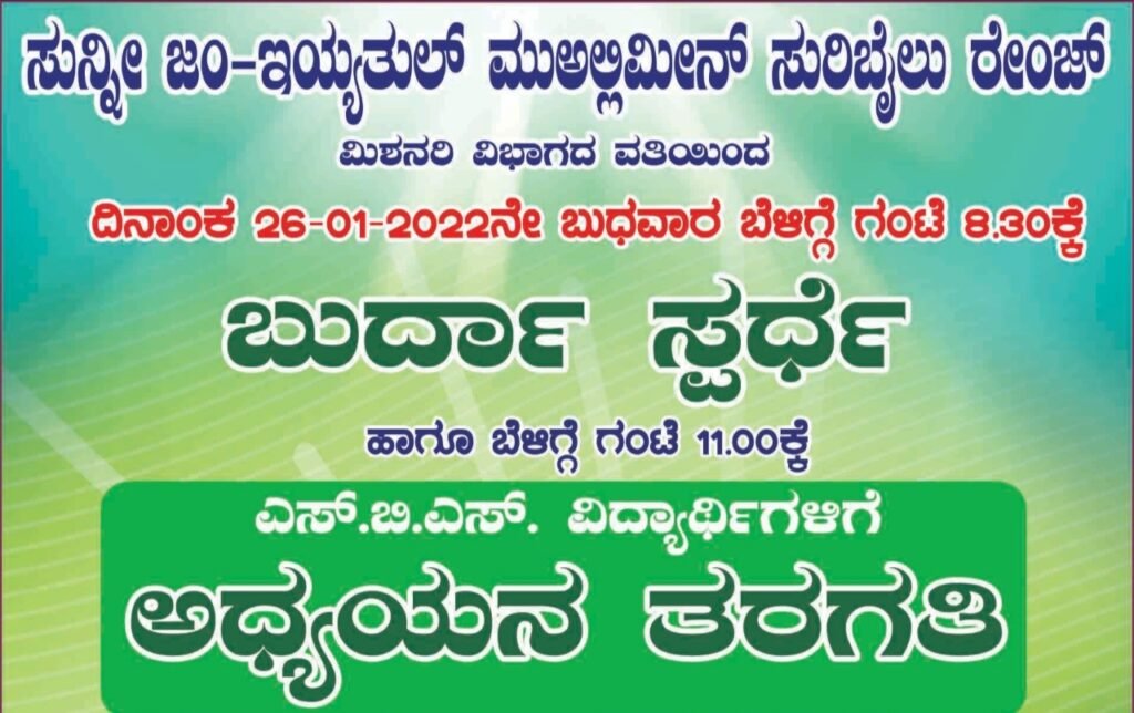 ಸುರಿಬೈಲು: ಸುನ್ನೀ ಜಂಇಯ್ಯತುಲ್ ಮುಅಲ್ಲಿಮೀನ್ ಸುರಿಬೈಲು ರೇಂಜ್ ಇದರ ಅಂಗವಾಗಿ ಕಾರ್ಯಾಚಿಸುತ್ತಿರುವ ಮಿಶನರಿ ವಿಭಾಗ ಗಣರಾಜ್ಯೋತ್ಸವ ಪ್ರಯುಕ್ತ ಆಯೋಜಿಸಿದ ಬುರ್ದಾ ಸ್ಪರ್ಧೆ , ಪ್ರಬಂಧ ಸ್ಪರ್ಧೆ ಹಾಗು ಭಾರತದ ನಕ್ಷೆ ಬಿಡಿಸುವ ಸ್ಪರ್ದೆ ಗಳು ಸುನ್ನೀ ಮಹಲ್ ಕಯ್ಯೂರು ಸಂಸ್ಥೆಯಲ್ಲಿ ಜ.26 ರಂದು ನಡೆಯಿತು.