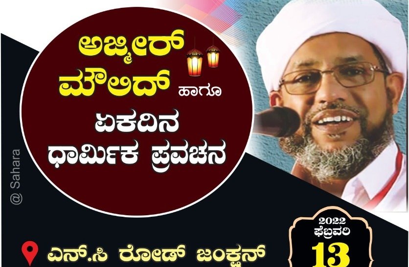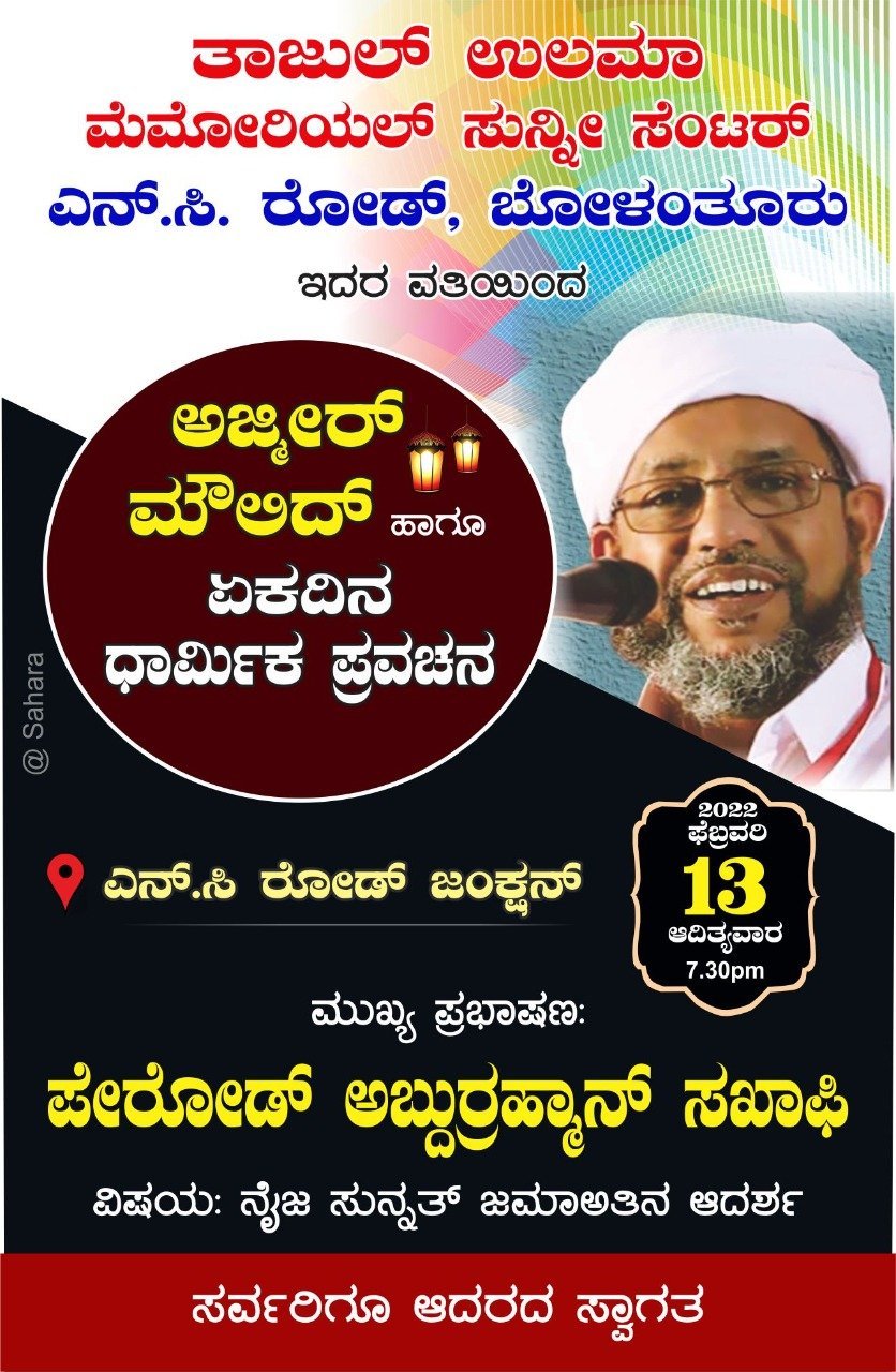 ಬೋಳಂತೂರು: ತಾಜುಲ್ ಉಲಮಾ ಮೆಮೋರಿಯಲ್ ಸುನ್ನೀ ಸೆಂಟರ್ ಎನ್,ಸಿ ರೋಡ್ ಇದರ ವತಿಯಿಂದ ಫೆ.13-2022 ಆದಿತ್ಯವಾರ ಸಂಜೆ 7:30ಗಂಟೆಗೆ ಅಜ್ಮೀರ್ ಮೌಲಿದ್ ಕಾರ್ಯಕ್ರಮ ನಡೆಯಲಿದೆ.