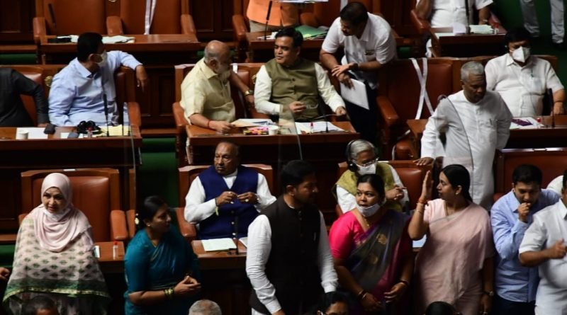 ದೇಶ ದ್ರೋಹಿ ಬಿಜೆಪಿ, ರಾಷ್ಟ್ರಧ್ವಜಕ್ಕೆ ಅಪಮಾನ ಮಾಡಿರುವ ಈಶ್ವರಪ್ಪ ರಾಜೀನಾಮೆ ನೀಡಬೇಕು. ನಮಗೆ ನ್ಯಾಯ ಬೇಕು. 40 ಪರ್ಸೆಂಟ್ ಕಮಿಷನ್ ಸರ್ಕಾರ, ಆರ್ಎಸ್ಎಸ್ ಕೈಗೊಂಬೆ ಎಂದು ಧಿಕ್ಕಾರದ ಘೋಷಣೆಗಳನ್ನು ಕೂಗಿದರು. ಪ್ರಶ್ನೋತ್ತರ ಕಲಾಪ ಮುಗಿಯಲಿ. ಅನೇಕ ಶಾಸಕರ ಕ್ಷೇತ್ರಗಳ ಸಮಸ್ಯೆಗಳ ಬಗ್ಗೆ ಚರ್ಚಿಸಿ ಪರಿಹಾರ ಕಂಡುಕೊಳ್ಳಬೇಕು. ನೀವೆಲ್ಲರೂ ಮೊದಲು ನಿಮ್ಮ ನಿಮ್ಮ ಸ್ಥಾನಗಳಿಗೆ ತೆರಳಿ ಎಂದು ಸಭಾಧ್ಯಕ್ಷ ವಿಶ್ವೇಶ್ವರ ಹೆಗಡೆ ಕಾಗೇರಿ ಮನವಿ ಮಾಡಿದರು.