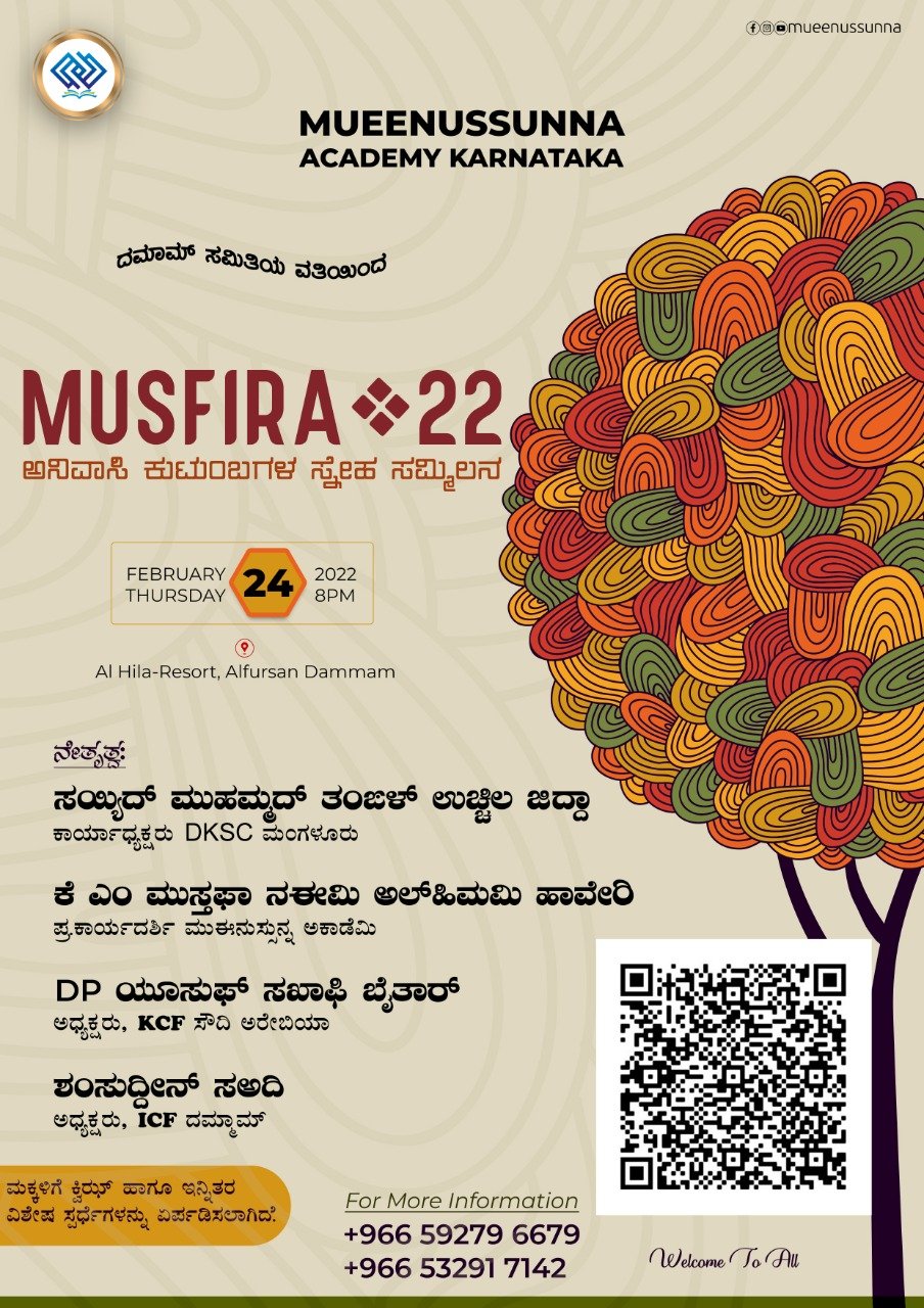 ದಿನಾಂಕ 24-2-2022ರಂದು ಗುರುವಾರ ಅಸ್ತಮಿಸಿದ ಶುಕ್ರವಾರ ರಾತ್ರಿ ,ದಮ್ಮಾಮ್ ನ ಅಲ್ ಹಿಲಾಲ್ ರಿಸೋರ್ಟ್, ನಲ್ಲಿ ಈ ಕಾರ್ಯಕ್ರಮ ಆಯೋಜಿಸಲಾಗಿದೆ….ಮುಸ್ಫಿರಾ ಕಾನ್ಫರೆನ್ಸ್ ಸ್ವಾಗತ ಸಮಿತಿ ಇದರ ಅಧ್ಯಕ್ಷ ರಾದ ಸಯ್ಯಿದ್ ಬಾವ ಬಣಕಲ್ ಬಜ್ಪೆ ಇವರ ಅಧ್ಯಕ್ಷತೆಯಲ್ಲಿ ನಡೆಯುವ ಸಮಾರಂಭದಲ್ಲಿ ಮುಈನುಸುನ್ನಾ ಓವರ್ಸಿಸ್ ಕೌನ್ಸಿಲ್ ಇದರ ಅಧ್ಯಕ್ಷ ರು ,DKSC ಇದರ ಕಾರ್ಯಾಧ್ಯಕ್ಷ ರಾದ ಸಯ್ಯಿದ್ ಮುಹಮ್ಮದ್ ತಂಙಳ್ ಉಚ್ಚಿಲ ದುಆ ನಡೆಸಲಿದ್ದಾರೆ..KCF ಇದರ ಸೌದಿ ಅರೇಬಿಯ ರಾಷ್ಟ್ರೀಯ ಅಧ್ಯಕ್ಷ ರಾದ DP ಯೂಸುಫ್ ಸಖಾಫಿ ಬೈತಾರ್ ಉದ್ಘಾಟನೆ ಮಾಡಲಿದ್ದಾರೆ.