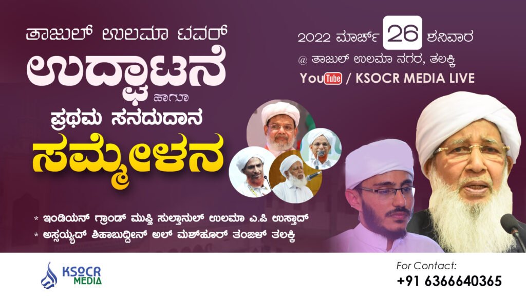 ಮುಡಿಪು: ತಾಜುಲ್ ಉಲಮಾ ಇಸ್ಲಾಮಿಕ್ ಕಾಂಪ್ಲೆಕ್ಸ್ ತಲಕ್ಕಿ ಸಂಸ್ಥೆಯ ವತಿಯಿಂದ ಕರ್ನಾಟಕದಲ್ಲೆ ಮೊತ್ತ ಮೊದಲು ಐತಿಹಾಸಿಕವಾಗಿ ನಿರ್ಮಿಸಲ್ಪಟ್ಟ ತಾಜುಲ್ ಉಲಮಾ ಟವರನ್ನು ಇಂಡಿಯನ್ ಗ್ರಾಂಡ್ ಮುಫ್ತಿ ಸುಲ್ತಾನುಲ್ ಉಲಮಾ ಎ.ಪಿ ಉಸ್ತಾದರು ಮಾರ್ಚ್ 26 ಶನಿವಾರ ರಾತ್ರಿ 7:00 ಗಂಟೆಗೆ ಉದ್ಘಾಟಿಸಲಿದ್ದಾರೆ.