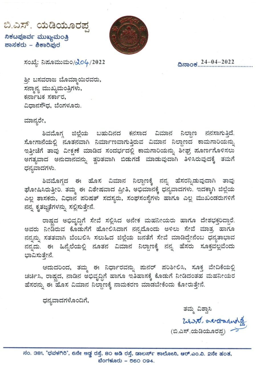 ಶಿವಮೊಗ್ಗದ ಈ ಹೊಸ ವಿಮಾನ ನಿಲ್ದಾಣಕ್ಕೆ ನನ್ನ ಹೆಸರನ್ನಿಡುವುದಾಗಿ ತಾವು ಘೋಷಿಸಿರುತ್ತೀರಿ. ತಮ್ಮ ಈ ವಿಶೇಷವಾದ ಪ್ರೀತಿ, ಅಭಿಮಾನಕ್ಕೆ ಧನ್ಯವಾದಗಳು. ಇದಕ್ಕಾಗಿ ಜಿಲ್ಲೆಯ ಎಲ್ಲ ಶಾಸಕರು, ವಿಧಾನ ಪರಿಷತ್ ಸದಸ್ಯರು, ಸಂಘ ಸಂಸ್ಥೆಗಳು ಹಾಗೂ ಎಲ್ಲ ಮುಖಂಡರುಗಳಿಗೆ ನನ್ನ ಕೃತಜ್ಞತೆಗಳನ್ನು ಸಲ್ಲಿಸುತ್ತೇನೆ. ರಾಷ್ಟ್ರದ ಅಭಿವೃದ್ಧಿಗೆ ಸೇವೆ ಸಲ್ಲಿಸಿದ ಅನೇಕ ಮಹನೀಯರು ಹಾಗೂ ದೇಶಭಕ್ತರಿದ್ದಾರೆ. ಅವರು ನೀಡಿರುವ ಕೊಡುಗೆಗೆ ಹೋಲಿಸಿದಾಗ ನನ್ನದೊಂದು ಅಳಿಲು ಸೇವೆ ಮಾತ್ರ ಹಾಗೂ ನನ್ನನ್ನು ಸತತವಾಗಿ ಬೆಂಬಲಿಸಿ ಸಲುಹಿದ ಜಿಲ್ಲೆಯ ಜನತೆಗೆ ಸೇವೆ ಮಾಡಿದ್ದೇನೆಂಬ ಧನ್ಯತಾಭಾವ ನನ್ನದು. ಈ ಹಿನ್ನೆಲೆಯಲ್ಲಿ ನೂತನ ವಿಮಾನ ನಿಲ್ದಾಣಕ್ಕೆ ನನ್ನ ಹೆಸರು ಸೂಕ್ತವಲ್ಲವೆಂದು ಭಾವಿಸುತ್ತೇನೆ. ಆದುದರಿಂದ, ತಮ್ಮ ಈ ನಿರ್ಧಾರವನ್ನು ಪುನರ್ ಪರಿಶೀಲಿಸಿ, ಸೂಕ್ತ ವೇದಿಕೆಯಲ್ಲಿ ಚರ್ಚಿಸಿ. ರಾಷ್ಟ್ರದ, ನಾಡಿನ ಅಭಿವೃದ್ಧಿಗೆ ಹಾಗೂ ಇತಿಹಾಸಕ್ಕೆ ಕೊಡುಗೆ ನೀಡಿದಂತಹ ಮಹನೀಯರ ಹೆಸರನ್ನು ಈ ಹೊಸ ವಿಮಾನ ನಿಲ್ದಾಣಕ್ಕೆ ನಾಮಕರಣ ಮಾಡಬೇಕೆಂದು ಕೋರುತ್ತೇನೆ ಎಂದು ಬರೆದಿದ್ದಾರೆ.