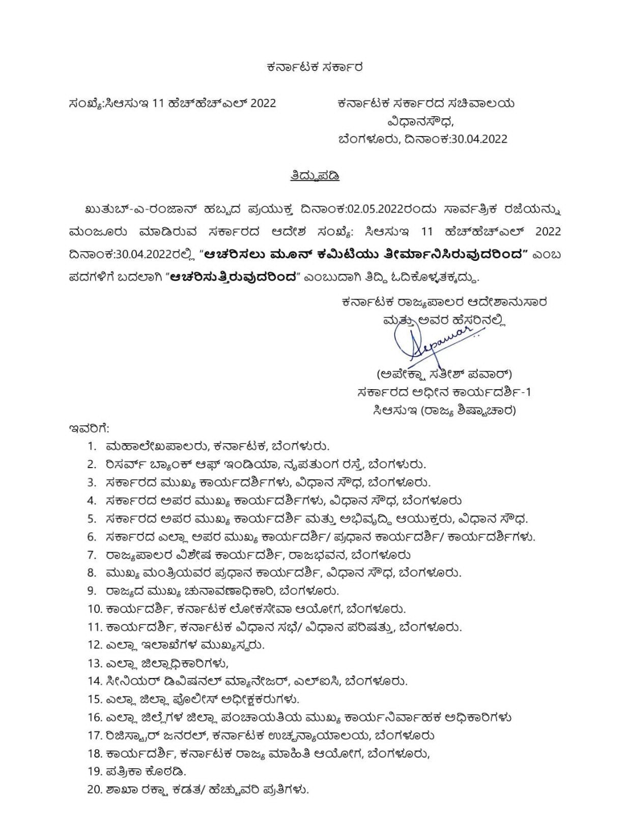 ರಾಜ್ಯ ಸರ್ಕಾರದ ಸಿಬ್ಬಂದಿ ಮತ್ತು ಆಡಳಿತ ಸುಧಾರಣಾ ಇಲಾಖೆಯ ಅಧೀನ ಕಾರ್ಯದರ್ಶಿ ಶನಿವಾರ ಅಧಿಸೂಚನೆಯನ್ನು ಹೊರಡಿಸಿ, ರಂಜಾನ್ ಹಬ್ಬದ ಅಂಗವಾಗಿ ಮೇ 3ರಂದು ಮಂಜೂರು ಮಾಡಲಾಗಿದ್ದ ರಜೆಯನ್ನು, ಚಂದ್ರ ದರ್ಶನ ಸಮಿತಿಯ ತೀರ್ಮಾನದಂತೆ ಮೇ 2ರಂದು ಮಂಜೂರು ಮಾಡಿ ಆದೇಶಿಸಿರುವುದಾಗಿ ತಿಳಿಸಿದ್ದಾರೆ.