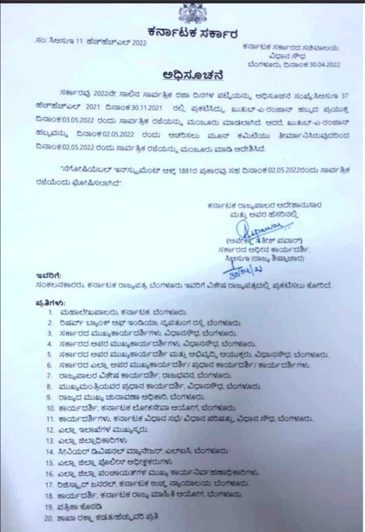 ಆದರೆ, ಇದೀಗ ರಾಜ್ಯ ಸರ್ಕಾರವು ಮೇ.3 ರಂದು ಘೋಷಿಸಿದ್ದ ಈದ್ ಹಬ್ಬ ಪ್ರಯುಕ್ತ ಸಾರ್ವತ್ರಿಕ ರಜೆಯನ್ನು ಚಂದ್ರ ದರ್ಶನ ಸಮಿತಿಯ ತೀರ್ಮಾನದಂತೆ ಮೇ.2 ಕ್ಕೆ ಬದಲಾಯಿಸಲಾಗಿದೆ ಎಂದು ಅಧಿಸೂಚನೆ ಹೊರಡಿಸಿದೆ. ರಾಜ್ಯ ಸರ್ಕಾರವು ನೆಗೋಷಿಯೆಬಲ್ ಇನ್ ಸ್ಟ್ರುಮೆಂಟ್ ಆಕ್ಟ್ 1881ರ ಪ್ರಕಾರ, ಮೇ 2, 2022ರಂದು ಸಾರ್ವತ್ರಿಕ ರಜೆ ಘೋಷಿಸಲಾಗಿದೆ ಎಂದು ಅಧಿಸೂಚನೆಯಲ್ಲಿ ತಿಳಿಸಲಾಗಿದೆ.
