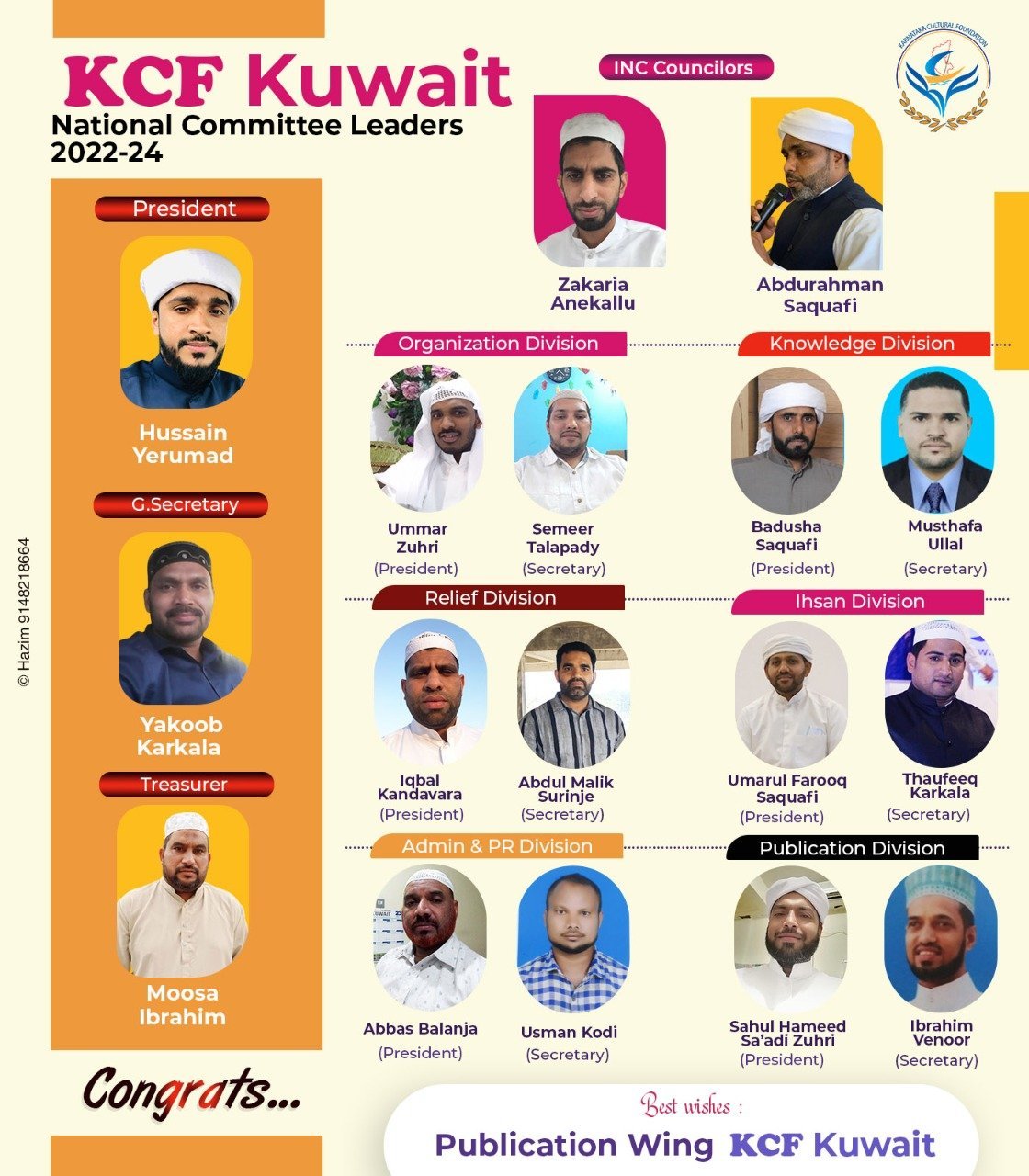 ಕುವೈಟ್ ಸಿಟಿ: ಕರ್ನಾಟಕ ಕಲ್ಚರಲ್ ಪೌಂಡೇಶನ್(ಕೆಸಿಎಫ್) ಕುವೈಟ್ ರಾಷ್ಟ್ರೀಯ ಸಮಿತಿಗೆ 2022-2023 ರ ಸಾಲಿನ ನವ ಸಾರಥಿಗಳಾಗಿ ಅಧ್ಯಕ್ಷರಾಗಿ ಹುಸೈನ್ ಮುಸ್ಲಿಯಾರ್ ಎರ್ಮಾಡ್, ಪ್ರಧಾನ ಕಾರ್ಯದರ್ಶಿಯಾಗಿ ಯಾಕೂಬ್ ಕಾರ್ಕಳ ಕೋಶಾಧಿಕಾರಿಯಾಗಿ ಮೂಸಇಬ್ರಾಹಿಂ ಇವರನ್ನು ಆಯ್ಕೆ ಮಾಡಲಾಯಿತು.