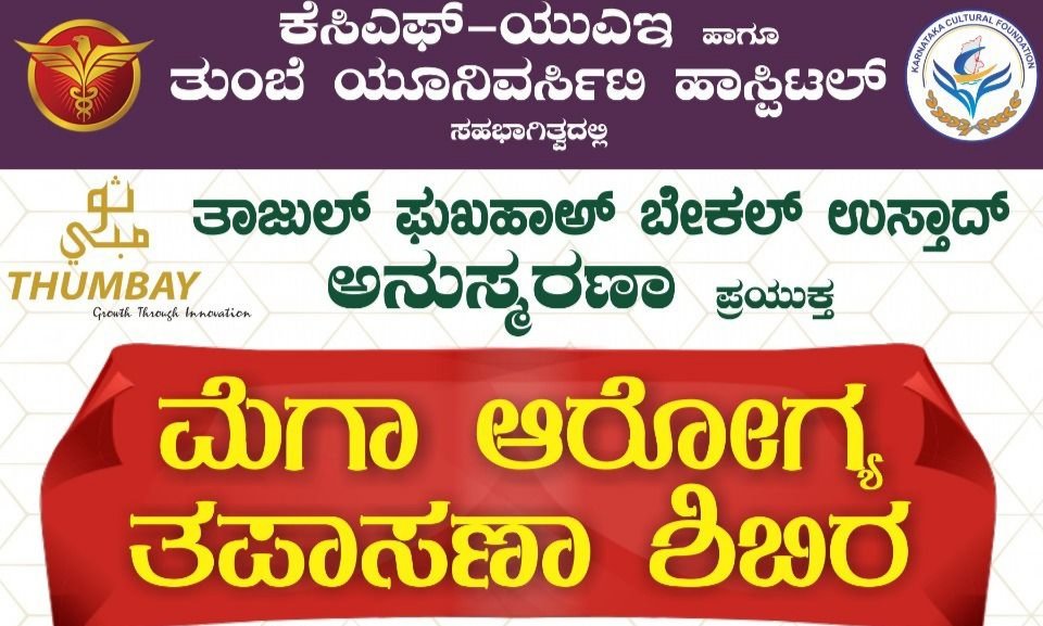 ಅಜ್ಮಾನ್ :ಕೆ.ಸಿ.ಎಫ್ ರಾಷ್ಟ್ರೀಯ ಸಮಿತಿ ಯು.ಎ.ಇ ಹಾಗೂ ತುಂಬೆ ಯೂನಿವರ್ಸಿಟಿ ಹಾಸ್ಪಿಟಲ್ ಸಹಭಾಗಿತ್ವದಲ್ಲಿ ತಾಜುಲ್ ಫುಖಹಾಅ್ ಬೇಕಲ್ ಉಸ್ತಾದ್ ಅನುಸ್ಮರಣೆಯ ಪ್ರಯುಕ್ತ ಮೆಗಾ ಆರೋಗ್ಯ ತಪಾಸಣಾ ಶಿಬಿರವು ನಡೆಯಲಿದೆ.