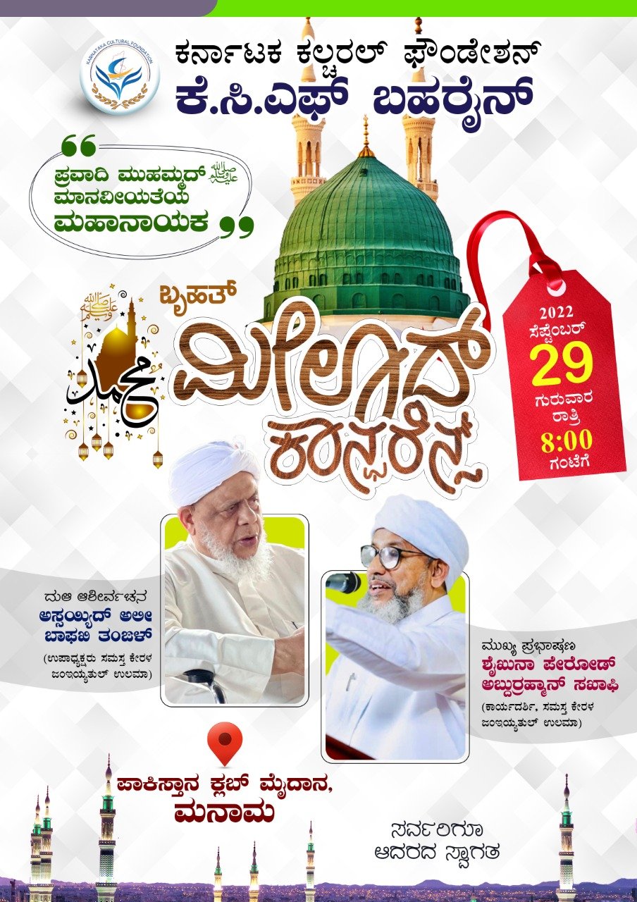ಕರ್ನಾಟಕ ಕಲ್ಚರಲ್ ಫೌಂಡೇಶನ್ (ಕೆಸಿಎಫ್) ಬಹರೈನ್ ವತಿಯಿಂದ ಸೆಪ್ಟೆಂಬರ್ 29ರ ಗುರುವಾರ ಅಸ್ತಮಿಸಿದ ಶುಕ್ರವಾರ ರಾತ್ರಿ 08ಗಂಟೆಯಿಂದ ಮನಾಮದಲ್ಲಿರುವ ಪಾಕಿಸ್ತಾನ ಕ್ಲಬ್ ಮೈದಾನದಲ್ಲಿ ಬೃಹತ್ ಮೀಲಾದ್ ಕಾನ್ಫರೆನ್ಸ್ ಕಾರ್ಯಕ್ರಮ ನಡೆಯಲಿದೆ. ಕಾರ್ಯಕ್ರಮಕ್ಕೆ ಮುಖ್ಯ ಅತಿಥಿಯಾಗಿ ಅಸ್ಸಯ್ಯಿದ್ ಅಲೀ ಬಾಫಖಿ ತಂಙಳ್ ರವರು ಆಗಮಿಸಲಿದ್ದು, ಮೌಲಾನಾ ಪೇರೋಡ್ ಅಬ್ದುರ್ರಹ್ಮಾನ್ ಸಖಾಫಿಯವರು ಮುಖ್ಯ ಪ್ರಬಾಷಣ ಮಾಡಲಿದ್ದಾರೆ.
