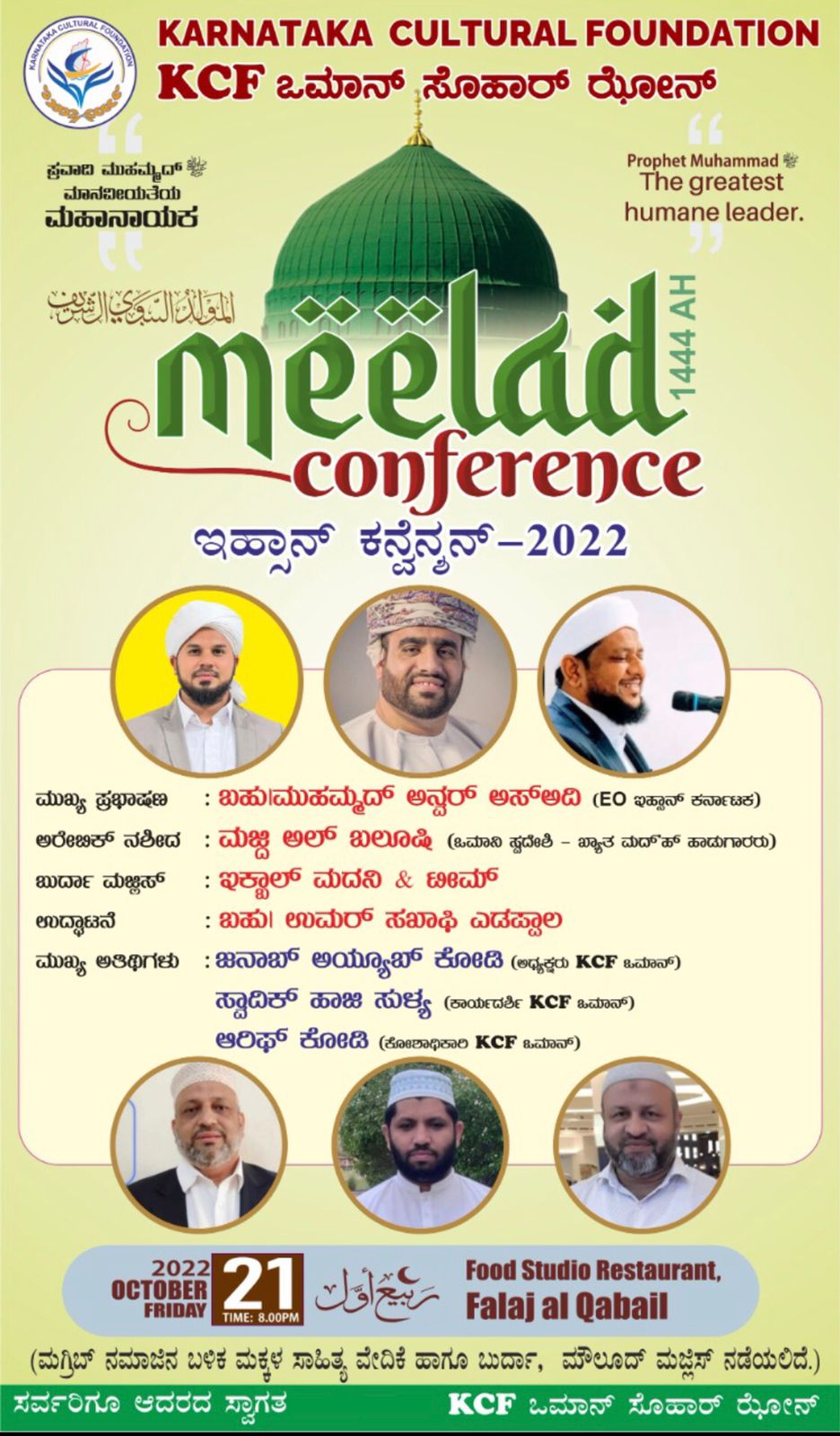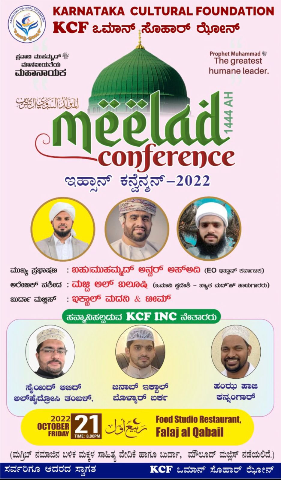 ಕರ್ನಾಟಕ ಕಲ್ಚರಲ್ ಫೌಂಡೇಶನ್ ಕೆಸಿಎಫ್ ಒಮಾನ್ ಸೊಹಾರ್ ಝೋನ್ ವತಿಯಿಂದ ಮಾನವೀಯತೆಯ ಮಹಾನಾಯಕ ಎಂಬ ಧ್ಯೇಯ ವಾಕ್ಯದೊಂದಿಗೆ ಬ್ರಹತ್ ಮೀಲಾದ್ ಕಾನ್ಫರೆನ್ಸ್ ಹಾಗೂ ಇಹ್ಸಾನ್ ಕನ್ವೆನ್ಶನ್-2022 ನಾಳೆ ತಾರೀಕು 21-10-2022 ರ ಶುಕ್ರವಾರ ರಾತ್ರಿ ಫಲಜ್ ನ ಫುಡ್ ಸ್ಟುಡಿಯೋ ರೆಸ್ಟೋರೆಂಟ್ ಸಭಾಂಗಣದಲ್ಲಿ ನಡೆಯಲಿದೆ.