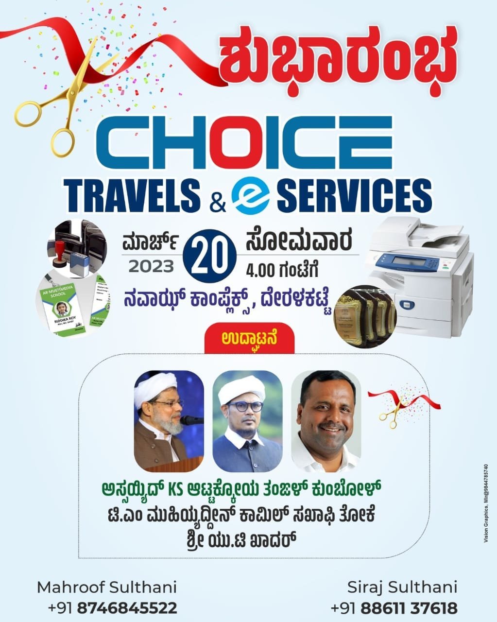 ಇಂದು ದೇರಳಕಟ್ಟೆಯಲ್ಲಿ ‘ಚಾಯ್ಸ್ ಟ್ರಾವಲ್ಸ್ ಮತ್ತು ಇ ಸರ್ವೀಸ್’ ಶುಭಾರಂಭ