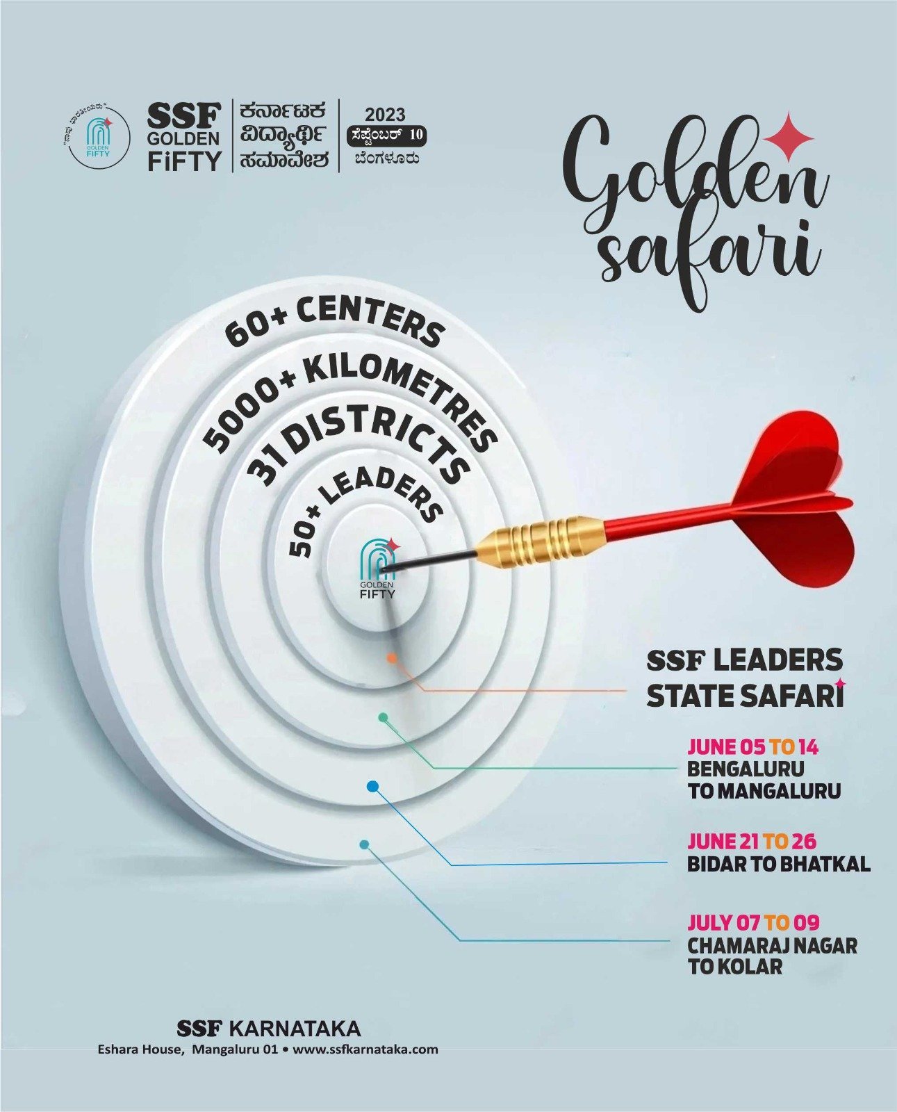 ಬೀದರ್ : ಕರ್ನಾಟಕ ರಾಜ್ಯ ಸುನ್ನೀ ಸ್ಟೂಡೆಂಟ್ಸ್ ಫೆಡರೇಷನ್ ಐವತ್ತನೇ ವರ್ಷಾಚರಣೆ ಪ್ರಯುಕ್ತ ಸೆಪ್ಟೆಂಬರ್ 10 ರಂದು ಬೆಂಗಳೂರಿನಲ್ಲಿ ನಡೆಯಲಿರುವ ಗೋಲ್ಡನ್ ಫಿಫ್ಟಿ ಮಹಾ ಸಮ್ಮೇಳನದ ಪ್ರಚಾರಾರ್ಥ ಹಮ್ಮಿಕೊಂಡಿರುವ ಗೋಲ್ಡನ್ ಸಫಾರಿ ಯಾತ್ರೆಯ ಮೊದಲನೇ ಹಂತ ಬೆಂಗಳೂರಿನಿಂದ ಮಂಗಳೂರು ವರೆಗೆ ಈಗಾಗಲೇ ಸಮಾಪ್ತಿಗೊಂಡಿದೆ.
