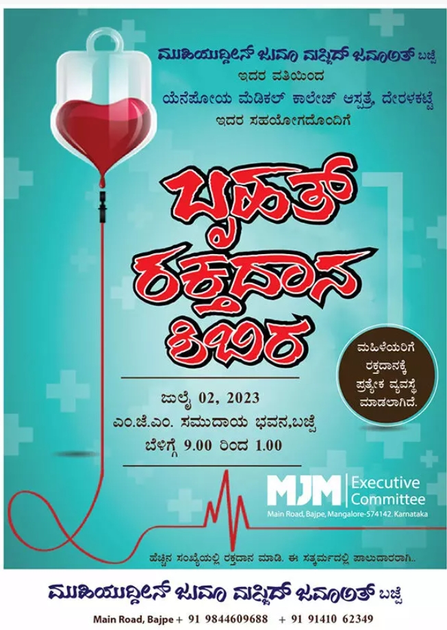 ದಕ್ಷಿಣ ಕನ್ನಡ ಜಿಲ್ಲೆಯಲ್ಲಿ ರಕ್ತದ ಕೊರತೆ ಎದ್ದು ಕಾಣುತ್ತಿರುವ ಕಾರಣ ಬಜ್ಪೆ ಮುಹಿಯುದ್ದೀನ್ ಜುಮಾ ಮಸೀದಿ ಇದರ ವತಿಯಿಂದ ಯೆನೆಪೋಯ ಮೆಡಿಕಲ್ ಕಾಲೇಜು ಆಸ್ಪತ್ರೆ, ದೇರಳಕಟ್ಟೆ ಇದರ ಸಹಯೋಗದೊಂದಿಗೆ “ಬೃಹತ್ ರಕ್ತದಾನ ಶಿಬಿರ” ಜುಲೈ 2 ರಂದು ಬೆಳಗ್ಗೆ 9 ರಿಂದ ಮಧ್ಯಾಹ್ನ 1 ಘಂಟೆಯವರೆಗೆ ಎಂ.ಜೆ.ಎಂ. ಸಮುದಾಯ ಭವನ ಬಜ್ಪೆಯಲ್ಲಿ ನಡೆಯಲಿರುವುದು.