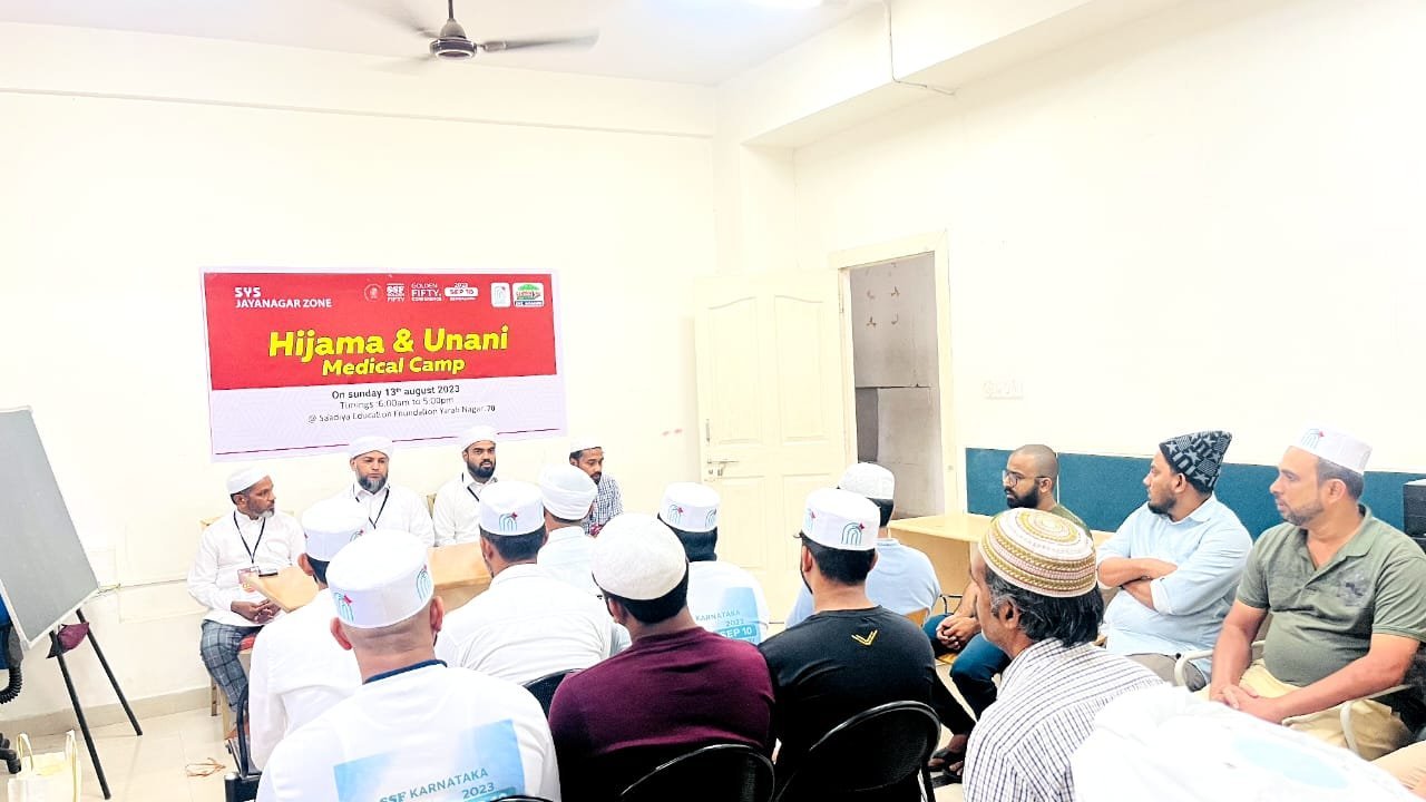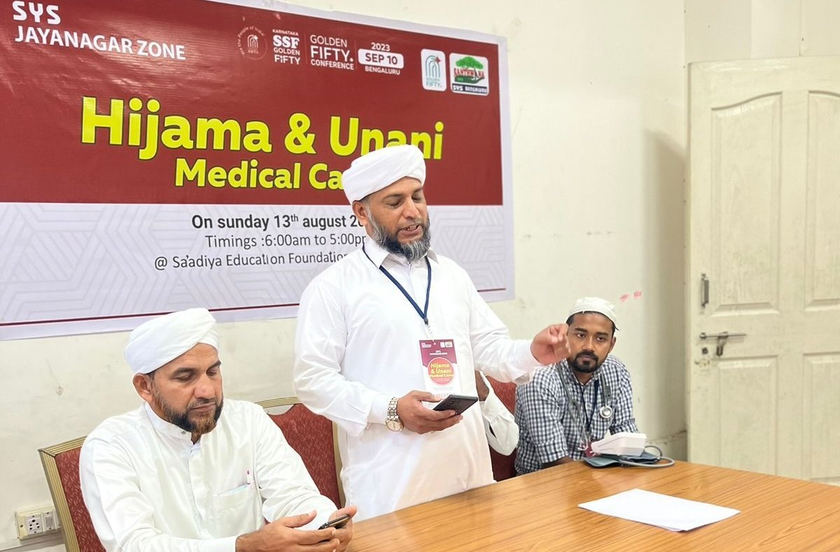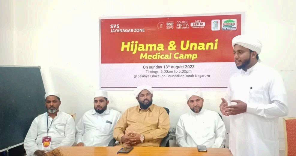 ಬೆಂಗಳೂರು : ಎಸ್ ಎಸ್ ಎಫ್ ಗೋಲ್ಡನ್ ಫಿಫ್ಟಿ ಮಹಾಸಮ್ಮೇಳನದ ಪ್ರಚಾರಾರ್ಥ ಎಸ್ ವೈ ಎಸ್ ಜಯನಗರ ಝೋನ್ ವತಿಯಿಂದ ಹಿಜಾಮ ಮತ್ತು ಯುನಾನಿ ವೈದ್ಯಕೀಯ ಶಿಬಿರ 13 ಆಗಸ್ಟ್ 2013 ರಂದು ಸ’ಅದಿಯ ಎಜುಕೇಶನ್ ಫೌಂಡೇಶನ್ ಯಾರಬ್ನಗರ ದಲ್ಲಿ ನಡೆಯಿತು.