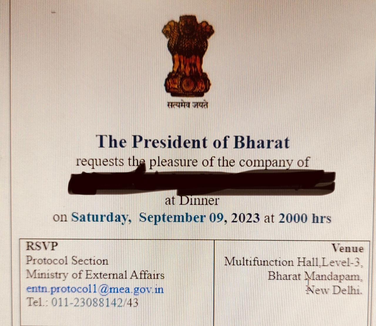ರಾಷ್ಟ್ರಪತಿ ಭವನದ ಆಹ್ವಾನ ಪತ್ರಿಕೆಯಲ್ಲಿ ಪ್ರೆಸಿಡೆಂಟ್‌ ಆಫ್‌ ಇಂಡಿಯಾ ಬದಲು ಪ್ರೆಸಿಡೆಂಟ್‌ ಆಫ್‌ ಭಾರತ್‌ ಎಂದು ಉಲ್ಲೇಖ ಮಾಡಲಾಗಿದೆ