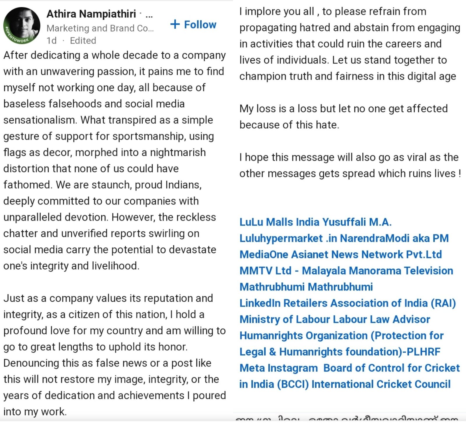 ಕೊಚ್ಚಿ: ಲುಲು ಮಾಲ್ನಲ್ಲಿ ಪ್ರದರ್ಶಿಸಿದ ಪಾಕಿಸ್ತಾನದ ಧ್ವಜವು ಭಾರತದ ಧ್ವಜಕ್ಕಿಂತ ದೊಡ್ಡದಾಗಿದೆ ಎಂಬ ಸುಳ್ಳು ಸುದ್ದಿಯಿಂದಾಗಿ ಲುಲು ಮಾರ್ಕೆಟಿಂಗ್ ಮ್ಯಾನೇಜರ್ ಕೆಲಸ ಕಳೆದುಕೊಂಡಿದ್ದಾರೆ. ಹತ್ತು ವರ್ಷಕ್ಕೂ ಹೆಚ್ಚು ಕಾಲ ಲುಲು ಬ್ರ್ಯಾಂಡ್ ಮಾನ್ಯತೆ ನೋಡಿಕೊಳ್ಳುತ್ತಿದ್ದ ಆತಿರಾ ನಂಬ್ಯಾದಿರಿ ಅವರು ನಕಲಿ ಸುದ್ದಿಯಿಂದಾಗಿ ಕೆಲಸ ಕಳೆದುಕೊಂಡಿದ್ದಾರೆ. ಈ ಬಗ್ಗೆ ಸ್ವತಃ ಆತಿರಾ ತಮ್ಮ ಲಿಂಕ್ಡ್ಇನ್ ಖಾತೆ ಮೂಲಕ ಮಾಹಿತಿ ನೀಡಿದ್ದಾರೆ.