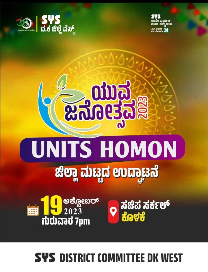 ಮಂಗಳೂರು: ಎಸ್ ವೈ ಎಸ್ ಕರ್ನಾಟಕ ಇದರ ಮೂವತ್ತನೇ ವಾರ್ಷಿಕ ಮಹಾ ಸಮ್ಮೇಳನವು 2024 ಜನವರಿ 24ರಂದು ಮಂಗಳೂರಿನಲ್ಲಿ ನಡೆಯಲಿದ್ದು ಅದರ ಭಾಗವಾಗಿ ದ. ಕ ಜಿಲ್ಲೆ ವೆಸ್ಟ್ ವತಿಯಿಂದ ನವಂಬರ್ ತಿಂಗಳ ಲ್ಲಿ ಯುವಜನೋತ್ಸವವು ಹಮ್ಮಿಕೊಂಡಿದ್ದು ಅದರ ಪ್ರಚಾರಾರ್ಥವಾಗಿ ದ. ಕ ಜಿಲ್ಲಾ ವೆಸ್ಟ್ ಇದರ ವ್ಯಾಪ್ತಿಯಲ್ಲಿರುವ ಯುನಿಟ್ ಕಾರ್ಯ ಕರ್ತರನ್ನು ಸರ್ಕಲ್ ಮಟ್ಟದಲ್ಲಿ ಸೇರಿಸಿ ಯುನಿಟ್ಸ್ ಹೋಮೋನ್ ಕಾರ್ಯ ಕ್ರಮವು ಅಕ್ಟೋಬರ್ 19ರಿಂದ 29ರ ತನಕ ನಡೆಯಲಿದೆ.