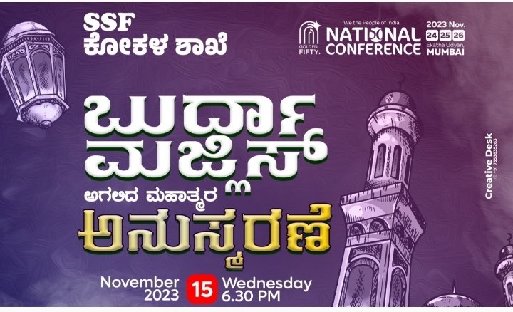 ಎಸ್ ಎಸ್ ಎಫ್ ಕೋಕಳ ಮಂಚಿ ಶಾಖೆ ಇದರ ವತಿಯಿಂದ ಬೃಹತ್ ಬುರ್ಧಾ ಮಜ್ಲಿಸ್ ಹಾಗೂ ಅಗಲಿದ ಮಹಾತ್ಮರ ಅನುಸ್ಮರಣಾ ಸಂಗಮವು ನವೆಂಬರ್ 15 ರಂದು ನಡೆಯಲಿದೆ.