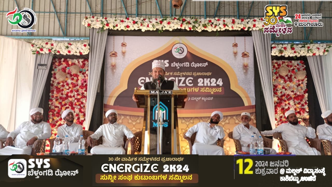 ಬೆಳ್ತಂಗಡಿ: SჄS ಕರ್ನಾಟಕ ರಾಜ್ಯ ಸಮಿತಿಯ 30 ನೇ ವಾರ್ಷಿಕ ಸಮ್ಮೇಳನ ದ ಪ್ರಚಾರಾರ್ಥ SჄS ಬೆಳ್ತಂಗಡಿ ಝೋನ್ ನಡೆಸಿದ ENARGIZE-2K24 ಸುನ್ನೀ ಸಂಘ ಕುಟುಂಬದ ಸಮ್ಮಿಲನ ಕಾರ್ಯಕ್ರಮ ದಿನಾಂಕ 2024 ಜನವರಿ 12 ರಂದು ಮಲ್ಜಅ್ ವಿದ್ಯಾಸಂಸ್ಥೆ ಬಹಳ ಯಶಸ್ವಿಯಾಗಿ ನಡೆಯಿತು.
