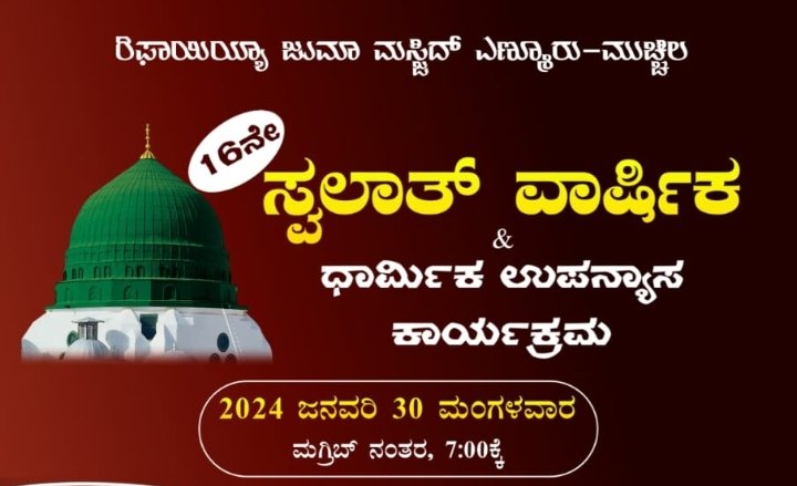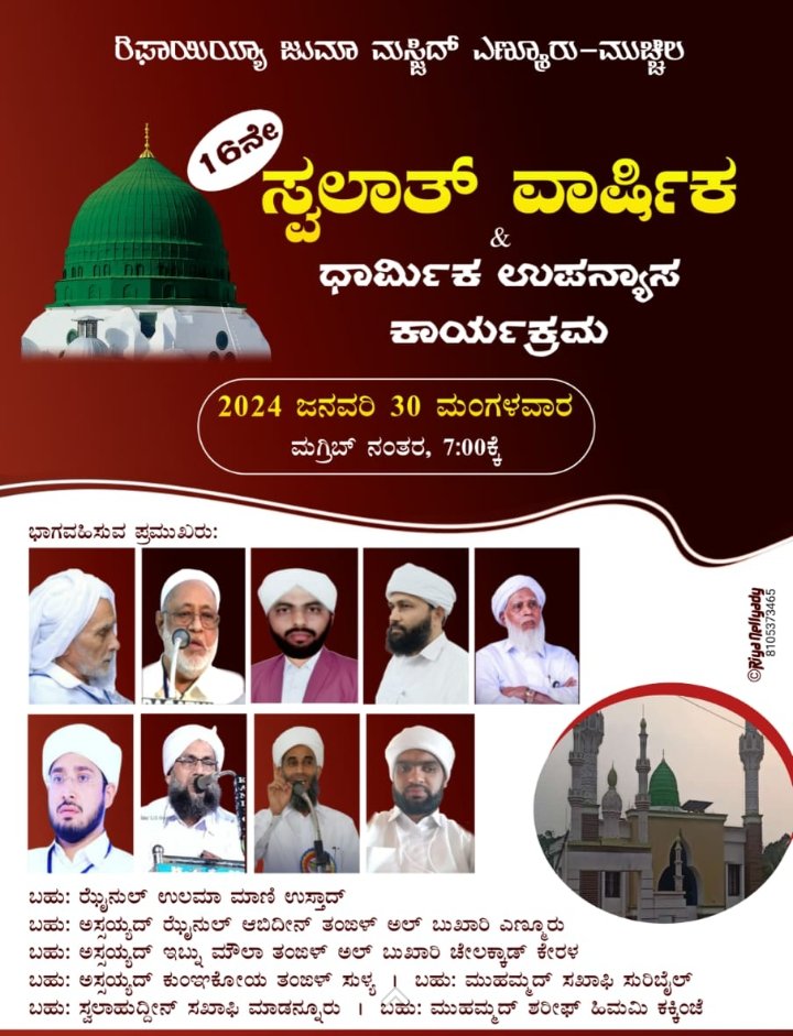 ಸುಳ್ಯ; ರಿಫಾಯಿಯ್ಯಾ ಜುಮಾ ಮಸ್ಜಿದ್ ಎಣ್ಮೂರು-ಮುಚ್ಚಿಲ ದಲ್ಲಿ ಪ್ರತಿ ತಿಂಗಳು ನಡೆಸಿಕೊಂಡು ಬರುತ್ತಿರುವ ಸ್ವಲಾತ್ ಮಜ್ಲಿಸ್ ಇದರ 16ನೇ ವಾರ್ಷಿಕ ಹಾಗೂ ಧಾರ್ಮಿಕ ಉಪನ್ಯಾಸ ಕಾರ್ಯಕ್ರಮವು ಇದೇ ಬರುವ ಜನವರಿ 30 ಮಂಗಳವಾರದಂದು ಮುಚ್ಚಿಲ ಮಸೀದಿಯ ವಠಾರದಲ್ಲಿ ನಡೆಯಲಿದೆ.