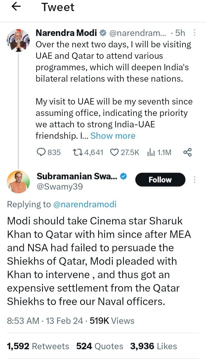 ಪ್ರಧಾನಮಂತ್ರಿ ನರೇಂದ್ರ ಮೋದಿ ಅವರು ಮಂಗಳವಾರ ತಮ್ಮ ಎರಡು ದಿನಗಳ ಯುಎಇ ಮತ್ತು ಕತಾರ್ ದೇಶಗಳ ಪ್ರವಾಸಕ್ಕೆ ತೆರಳಿರುವ ಮಧ್ಯೆಯೇ ಬಿಜೆಪಿಯ ಹಿರಿಯ ನಾಯಕ ಸುಬ್ರಮಣಿಯನ್ ಸ್ವಾಮಿ ಮಾಡಿರುವ ಟ್ವೀಟ್‌ವೊಂದು, ಸದ್ಯ ಸೋಷಿಯಲ್ ಮೀಡಿಯಾಗಳಲ್ಲಿ ವೈರಲಾಗಿದೆ.