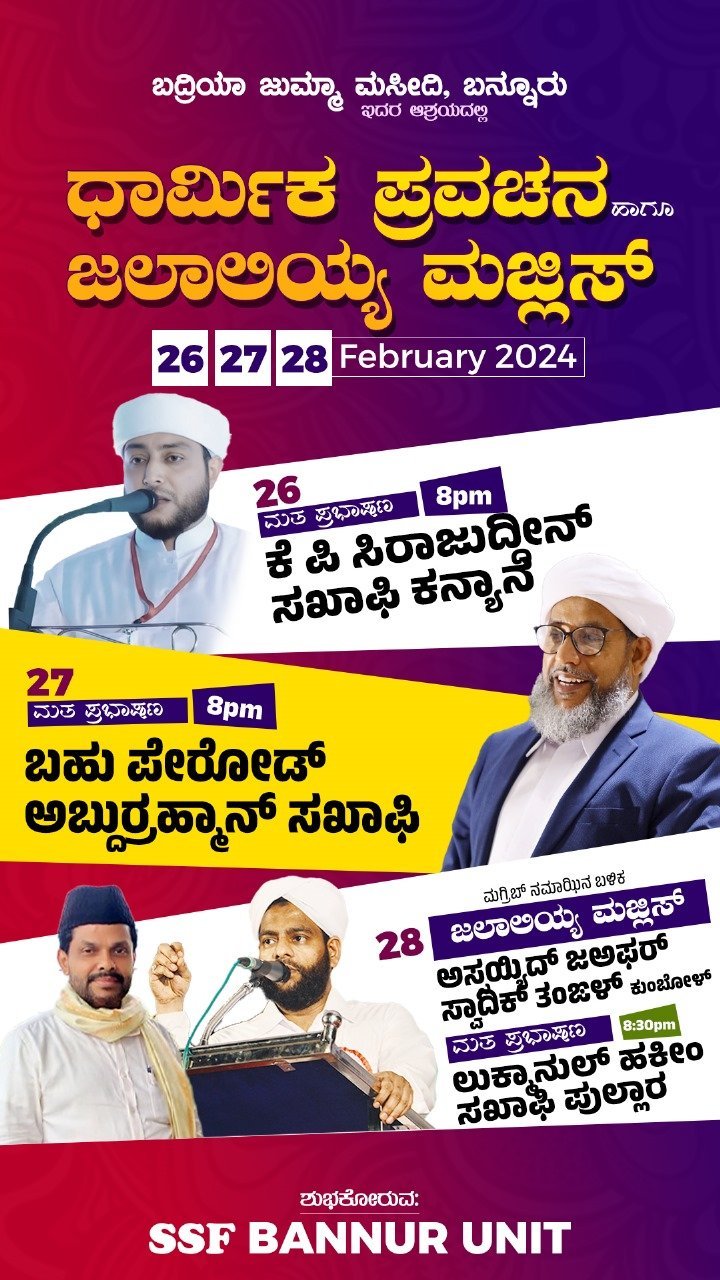 ಬದ್ರಿಯಾ ಜುಮಾ ಮಸೀದಿ ಬನ್ನೂರು ಇದರ ಆಶ್ರಯದಲ್ಲಿ ಧಾರ್ಮಿಕ ಉಪನ್ಯಾಸ ಹಾಗೂ ಜಲಾಲಿಯ್ಯ ರಾತೀಬ್ ಇದೇ ಬರುವ ಫೆಬ್ರವರಿ 26,27,28 ದಿನಾಂಕಗಳಲ್ಲಿ ತಾಜುಲ್ ಉಲಮಾ ವೇದಿಕೆ BJM ಬನ್ನೂರು ವಠಾರದಲ್ಲಿ ನಡೆಯಲಿದೆ.