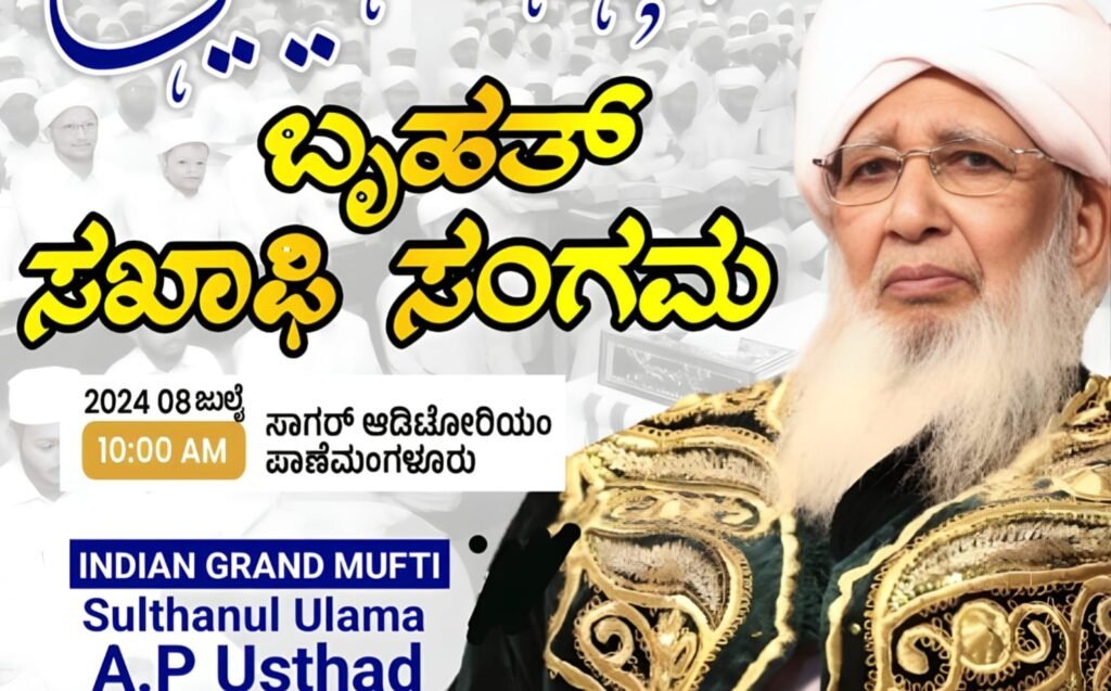 ಇಂಡ್ಯನ್ ಗ್ರಾಂಡ್ ಮುಫ್ತಿ ಸುಲ್ತಾನುಲ್ ಉಲಮಾ ಶೈಖುನಾ ಎ.ಪಿ ಉಸ್ತಾದ್ ರವರ ನೇತೃತ್ವದ ಜಾಗತಿಕ ಮಟ್ಟದಲ್ಲಿ ಗುರುತಿಸಲ್ಪಟ್ಟ ಕೇರಳದ ಕಲ್ಲಿಕೋಟೆ ಜಾಮಿಅ ಮರ್ಕಝ್ ಸಂಸ್ಥೆಯಿಂದ ಸಖಾಫಿ ಬಿರುದು ಪಡೆದ ಕರ್ನಾಟಕದ ಸಾವಿರದಷ್ಟು ಸಖಾಫಿ ವಿದ್ವಾಂಸರ ಸಂಗಮವು ನಾಳೆ ಬಿ.ಸಿ ರೋಡ್ ಸಮೀಪದ ಪಾಣೆಮಂಗಳೂರು ಸಾಗರ್ ಆಡಿಟೋರಿಯಂ ನಲ್ಲಿ ಬೆಳಿಗ್ಗೆ 10 ಗಂಟೆಗೆ ನಡೆಯಲಿದೆ,