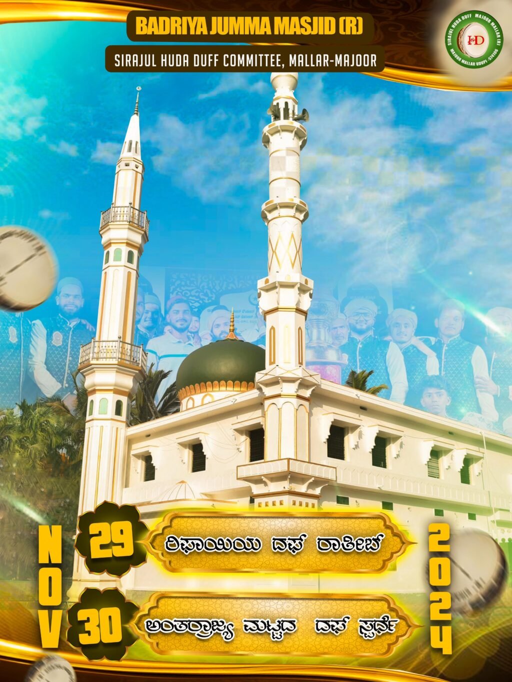 ನವೆಂಬರ್ 30 ಮಗ್ರಿಬ್ ನಮಾಜಿನ ಬಳಿಕ ಅಂತರ್ ರಾಜ್ಯ ಮಟ್ಟದ ದಫ್ ಸ್ಪರ್ಧಾಕೂಟ ನಡೆಯಲಿದ್ದು, ಸಿರಾಜುಲ್ ಹುದಾ ದಫ್ ಸಮಿತಿ ಅಧ್ಯಕ್ಷ ಅಶ್ರಫ್ ಮೂಸ ಮಜೂರು ಅಧ್ಯಕ್ಷತೆ ವಹಿಸಲಿದ್ದಾರೆ‌. ಸಮಿತಿ ಪ್ರಧಾನ ಕಾರ್ಯದರ್ಶಿ ಮುಹಮ್ಮದ್ ಕಬೀರ್ ಸ್ವಾಗತಿಸಲಿದ್ದು, ಬದ್ರಿಯ ಜುಮುಅ ಮಸ್ಜಿದ್ ಖತೀಬರಾದ ಅಲ್ಹಾಜ್ ಎಂ.ಕೆ. ಅಬ್ದುರ್ರಶೀದ್ ಸಖಾಫಿ ಅಲ್-ಕಾಮಿಲ್ ಉದ್ಘಾಟನೆ ನೆರವೇರಿಸಲಿದ್ದಾರೆ.