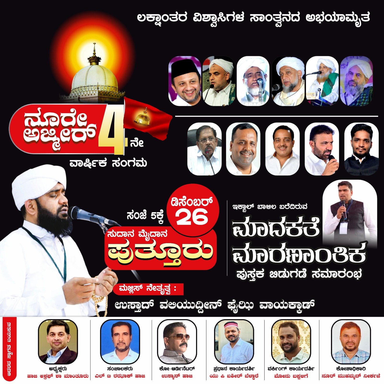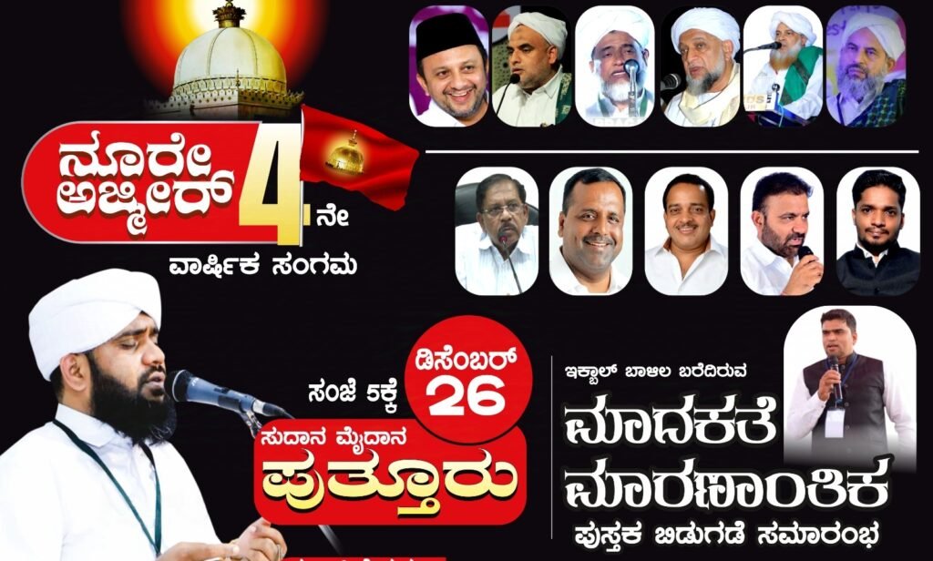 ಪುತ್ತೂರು: ನೂರೇ ಅಜ್ಮೀರ್ ನಾಲ್ಕನೇ ವಾರ್ಷಿಕ ಮಹಾ ಸಂಗಮ ಹಾಗೂ ಮಾದಕತೆ ಪುಸ್ತಕ ಬಿಡುಗಡೆ ಸಮಾರಂಭ ಡಿಸೆಂಬರ್ 26ರಂದು ಪುತ್ತೂರಿನ ಸುಧಾನ ಮೈದಾನದಲ್ಲಿ ನಡೆಯಲಿದೆ ಎಂದು ಸಂಘಟಕರು ತಿಳಿಸಿದ್ದಾರೆ.
