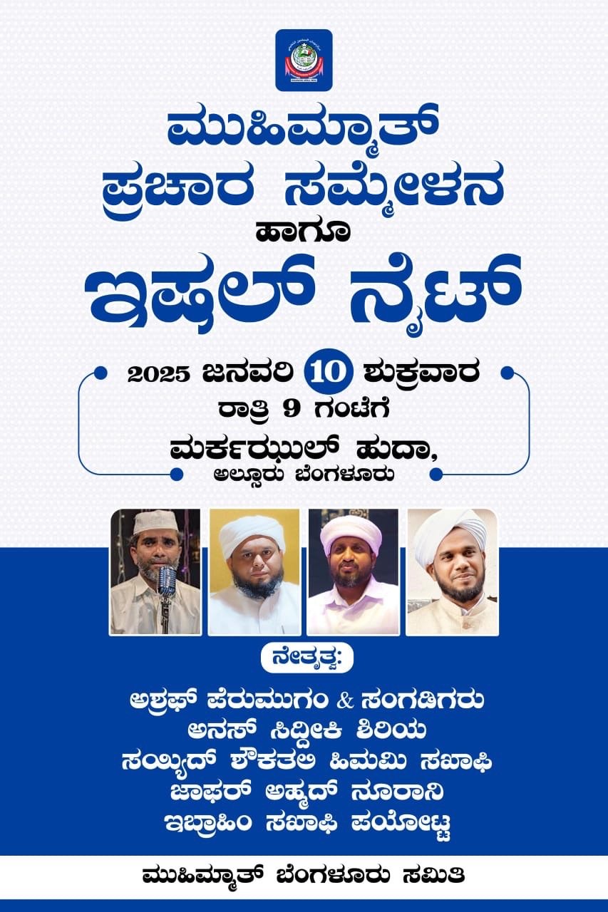 ಬೆಂಗಳೂರು: ಕಾಸರಗೋಡು ಜಿಲ್ಲೆಯ ಧಾರ್ಮಿಕ ಲೌಕಿಕ ಸಮನ್ವಯ ವಿದ್ಯಾ ಕೇಂದ್ರವಾದ ಮುಹಿಮ್ಮಾತುಲ್ ಮುಸ್ಲಿಮೀನ್ ಎಜ್ಯುಕೇಶನಲ್ ಸೆಂಟರ್ ಸಮ್ಮೇಳನ ಪ್ರಚಾರ ಹಾಗೂ ಸಯ್ಯದ್ ತ್ವಾಹಿರುಲ್ ಅಹ್ದಳ್ ತಂಙಳ್ ಅನುಸ್ಮರಣೆ ಹಾಗೂ ಇಶಲ್ ನೈಟ್ ಇಂದು(ಶುಕ್ರವಾರ) ರಾತ್ರಿ 09:00ಗಂಟೆಗೆ ಸರಿಯಾಗಿ ಹಲಸೂರು ಮರ್ಕಝುಲ್ ಹುದಾ ಮಸೀದಿಯಲ್ಲಿ ನಡೆಯಲಿದೆ.